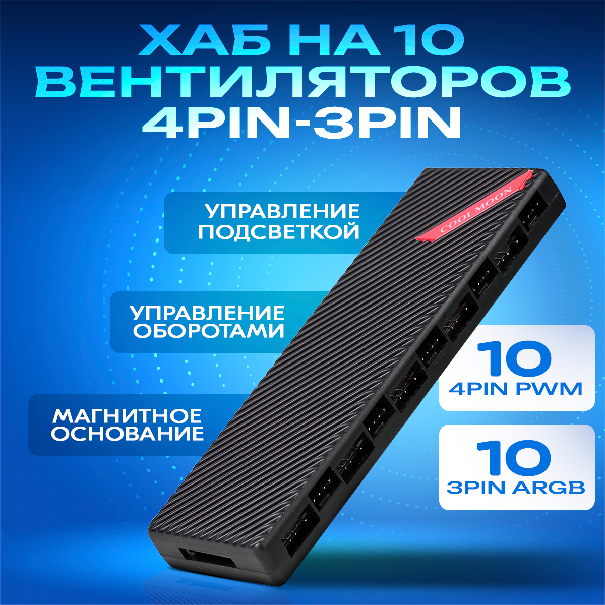 Контроллер COOLMOON на 10 вентиляторов (кулеров) с подсветкой, PWM+ARGB, 4Pin+3Pin, SATA кабель, магнитный низ, черный интересное: