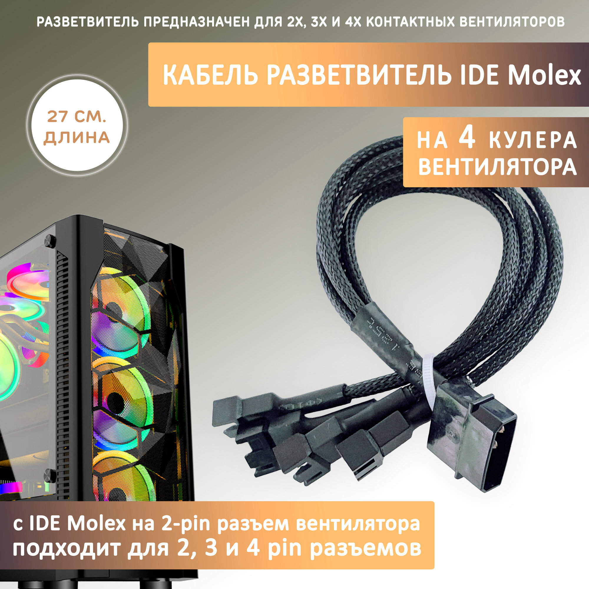 Кабель переходник/разветвитель на 4 кулера/вентилятора с IDE MOLEX. Удлинитель, 27см в оплетке интересное: