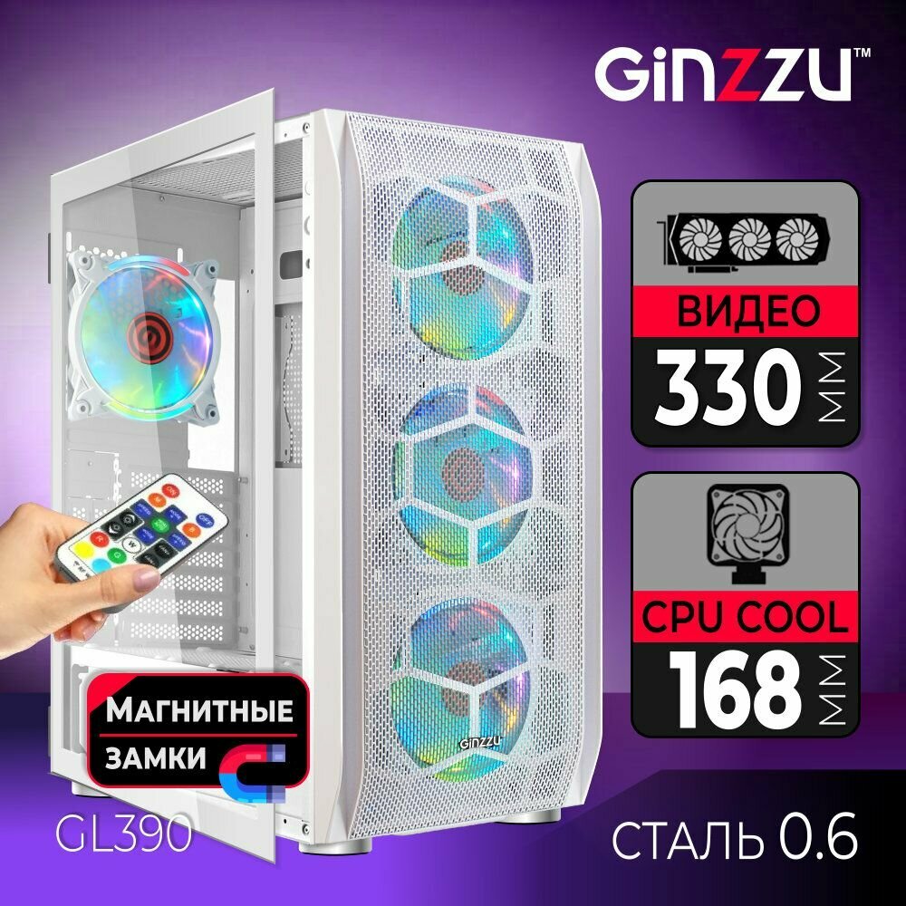 Корпус Ginzzu GL390 вентилятор 4*12CM RGB, Controller+ пульт CRC10, закаленное стекло на петлях с магнитным замком интересное: