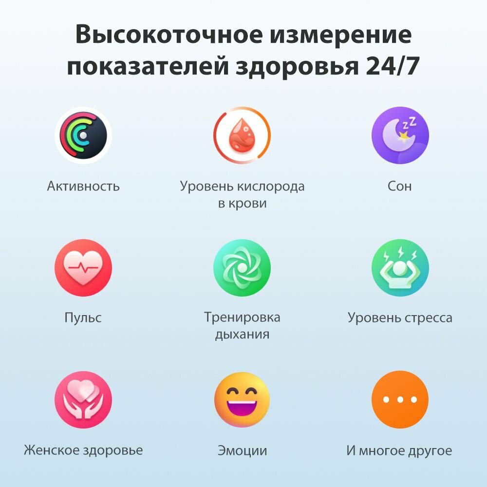 | Мониторинг | сна, уровня кислорода в крови, уровня стресса, физической активности |