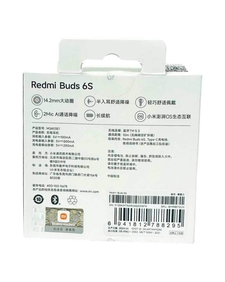 Наушники Xiaomi Redmi Buds 6S M2403E1, беспроводные, активное шумоподавление