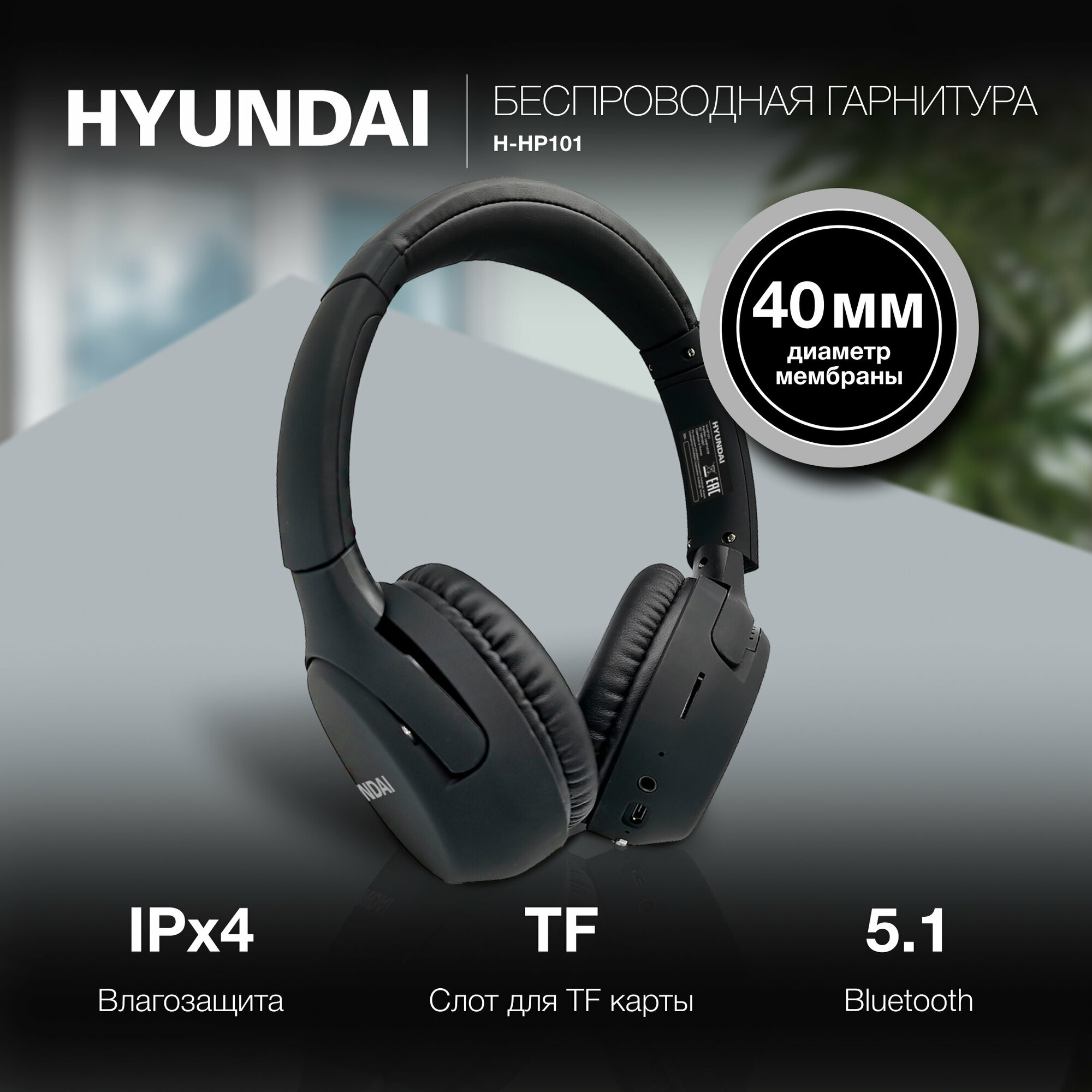 Наушники Hyundai H-HP101, Bluetooth, накладные, черный