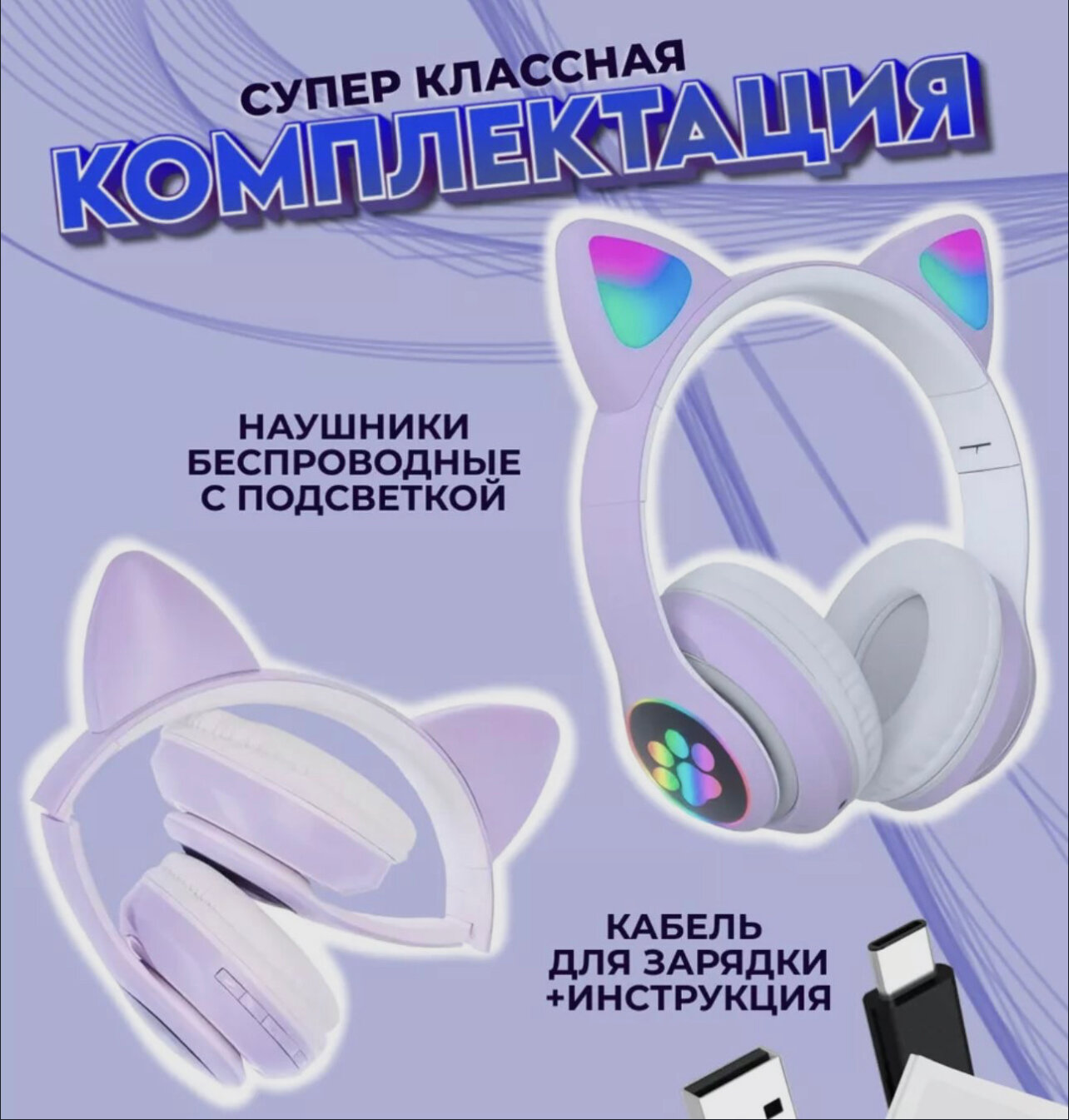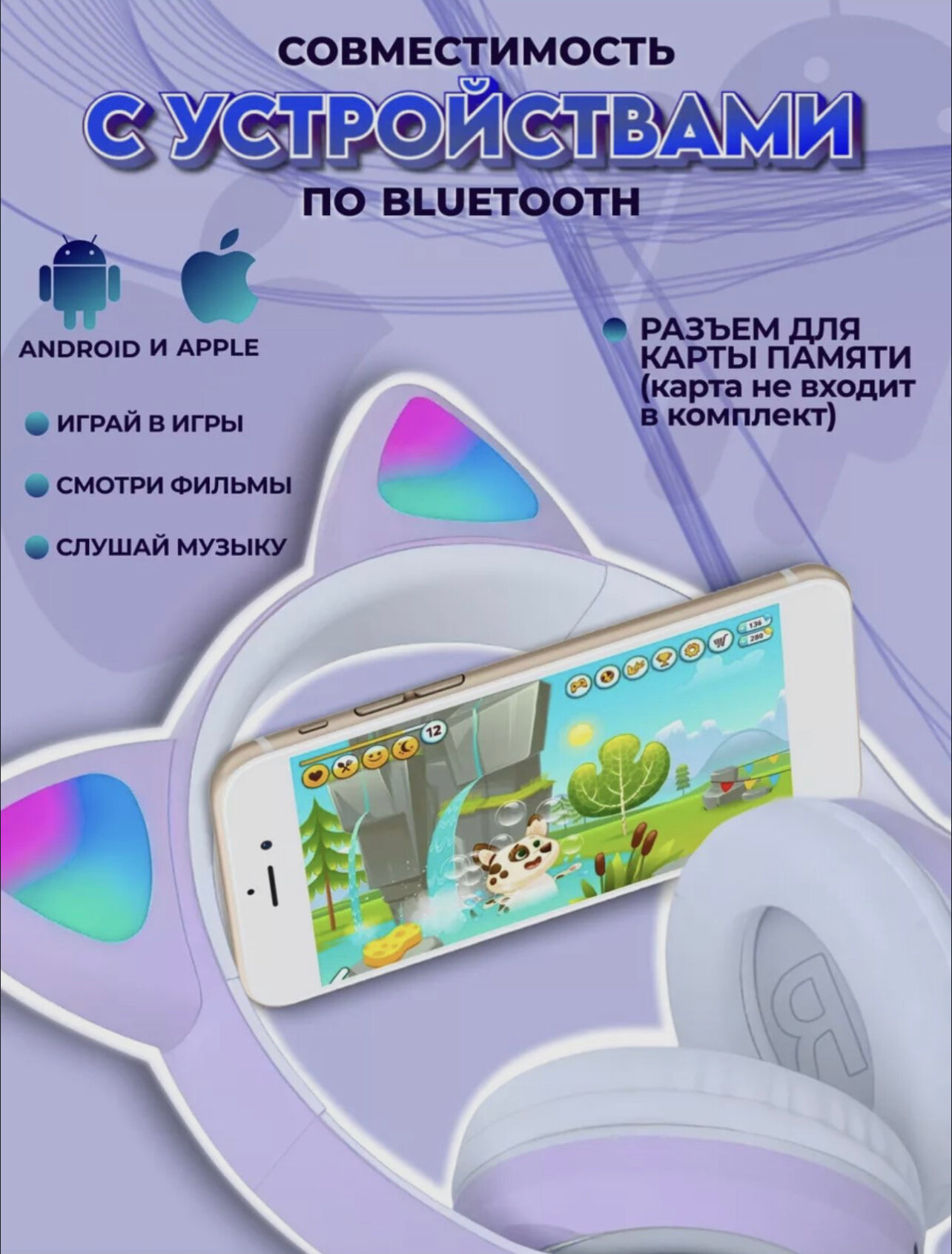 Беспроводные наушники CAT ear STN-28 с ушками, Bluetooth 5.0, с регулятором громкости, фиолетовые