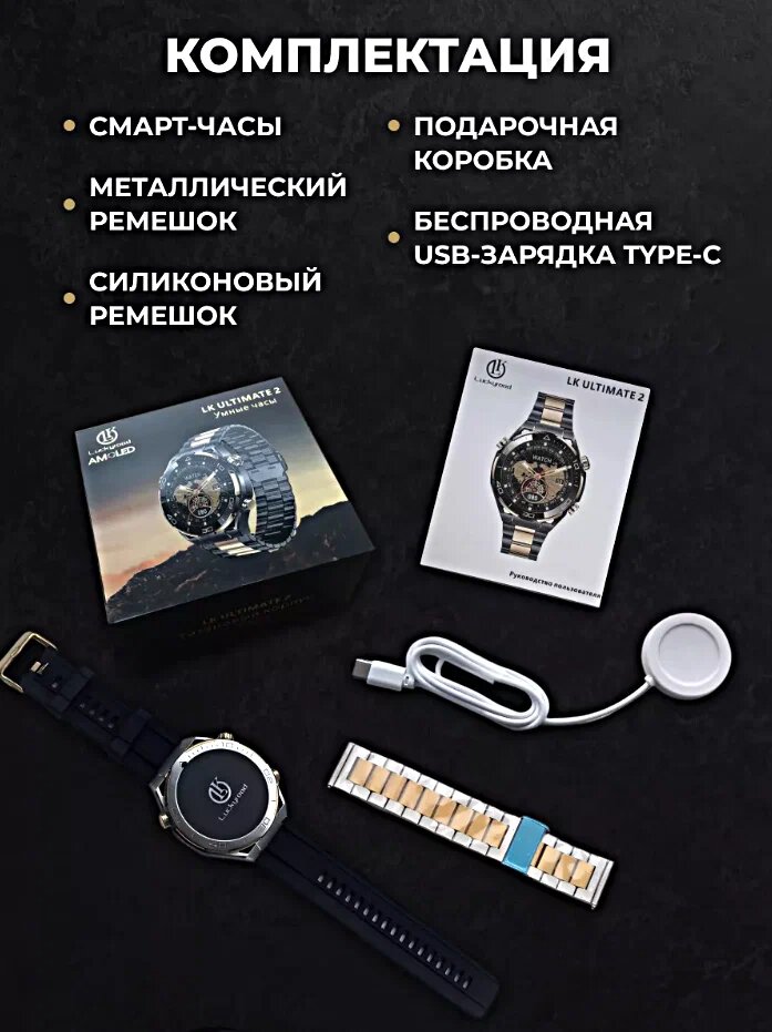 | Дополнительная информация | Комплектация Умные часы LK ULTIMATE 2, 2 ремешка(металл и силикон), Магнитная зарядка, Упаковка. |