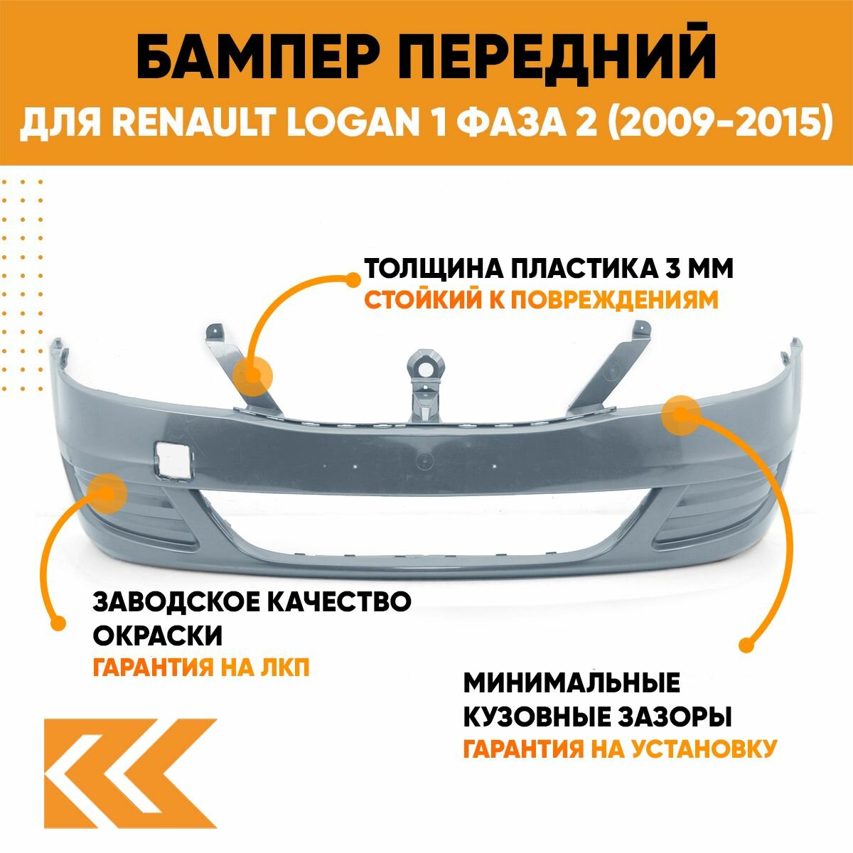 | Подробная комплектация | Бампер передний в цвет кузова для Рено Логан Renault Logan 1 фаза 2 (2009-2015) без отверстия под птф KNA - GRIS COMETE - Серый |