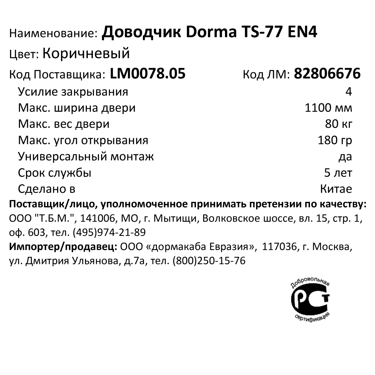 Dorma Доводчик дверной TS-77 корич. EN4 11439