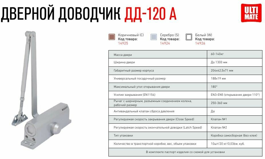 Булат Доводчик дверной ULTIMATE ДД-120 A-S (60-140 кг) серебро, морозостойкий(10) zm_14924
