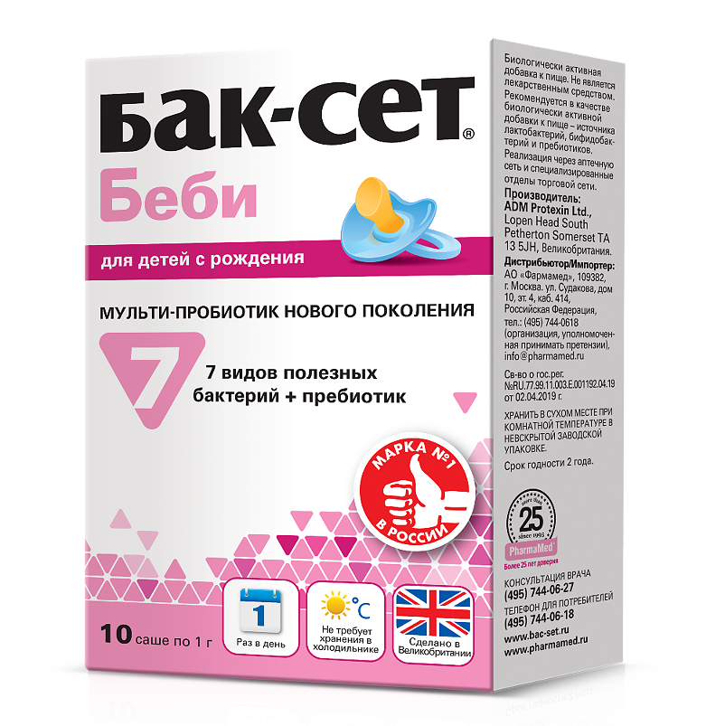| Способ применения и дозы | По 1 саше в день во время приема пищи. Содержимое саше развести в воде, молоке, соке, можно добавить в детское питание.Может применяться у детей с рождения. Режим приема на фоне антибиотикотерапии:Прием Бак-Сет беби следует начинать одновременно с приемом антибиотиков, и продолжать еще в течение 2-х недель после окончания антибиотикотерапии.В период перехода на новое питание (адаптированные смеси, прикорм) рекомендуется профилактический прием Бак-Сет беби в течение 1-2 недель.В период прорезывания зубов рекомендуется принимать Бак-Сет беби в течение 1-2 недель.Накануне посещения детского дошкольного учреждения или путешествия рекомендуется начать прием бак-Сет беби за 3-4 дня до предстоящего события и принимать в течение 1-2 недель. |