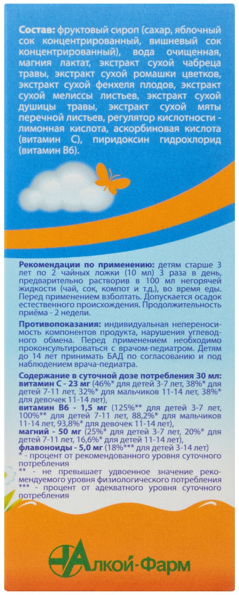 | Состав | Магния лактат, экстракт листьев мяты сухой, экстракт травы чабреца сухой, экстракт цветков ромашки сухой, фенхеля плодов экстракт сухой, экстракт листьев мелиссы лекарственной сухой, экстракт травы душицы, аскорбиновая кислота, витамин В6, вспомогательные компоненты (сахар, сок вишневый, сок яблочный, вода, Е330). |