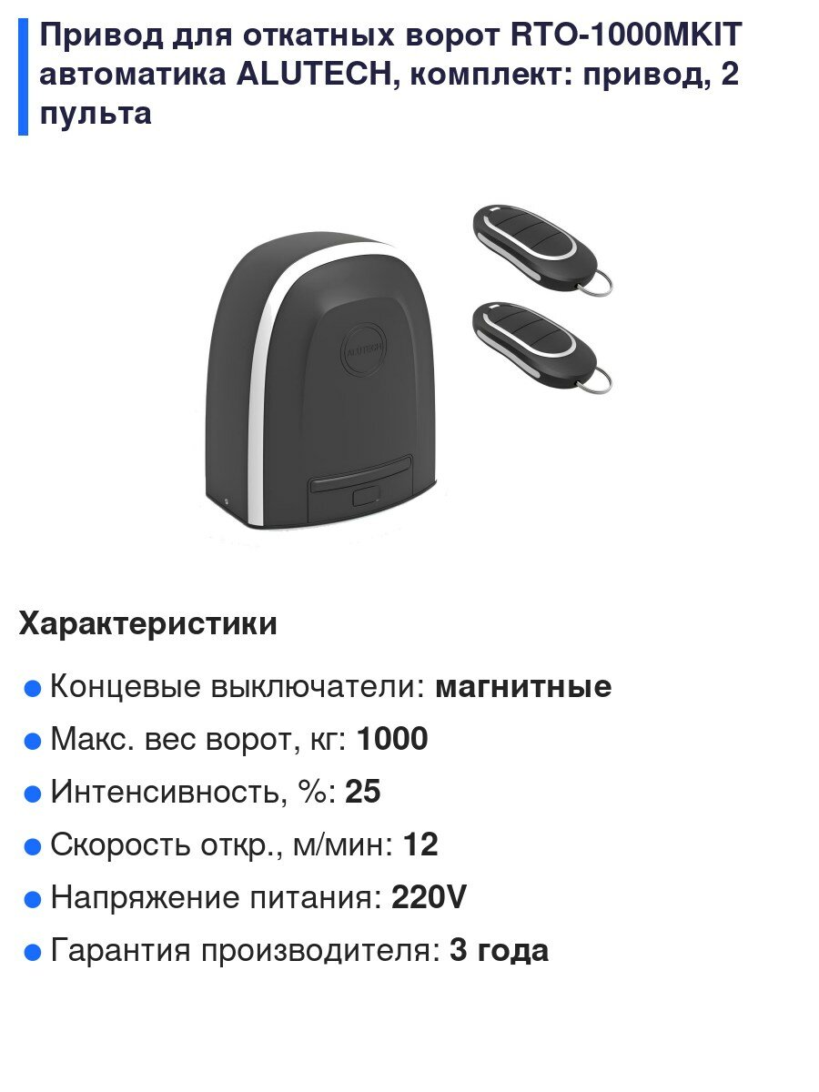 Ниже Вы можете прочитать отзывы на Комплект привода для откатных ворот Alutech RTO-1000KIT до 1000кг, ознакомится с подробными характеристиками, посмотреть интересные обзоры и фотографии на Комплект привода для откатных ворот Alutech RTO-1000KIT до 1000кг.