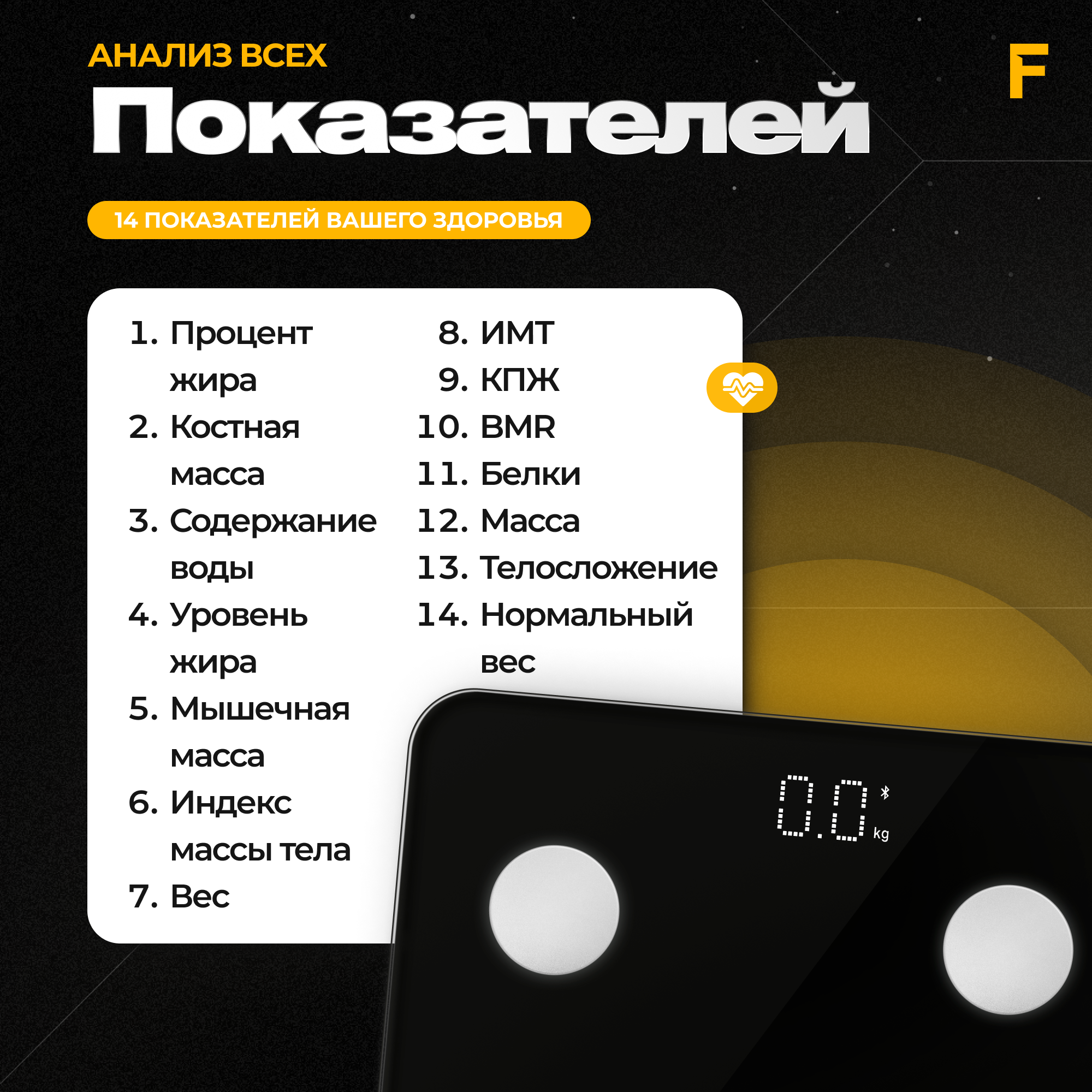 | Дополнительная информация | Комплексный анализ состояния тела; Синхронизируют данные с мобильным приложением; За одно взвешивание весы измеряют 14 важных показателей; Подсветка дисплея; Цветной экран; Выдвижная панель; Высокая точность измерений; Функция автоотключения/ включения; Цветной TFT дисплей |