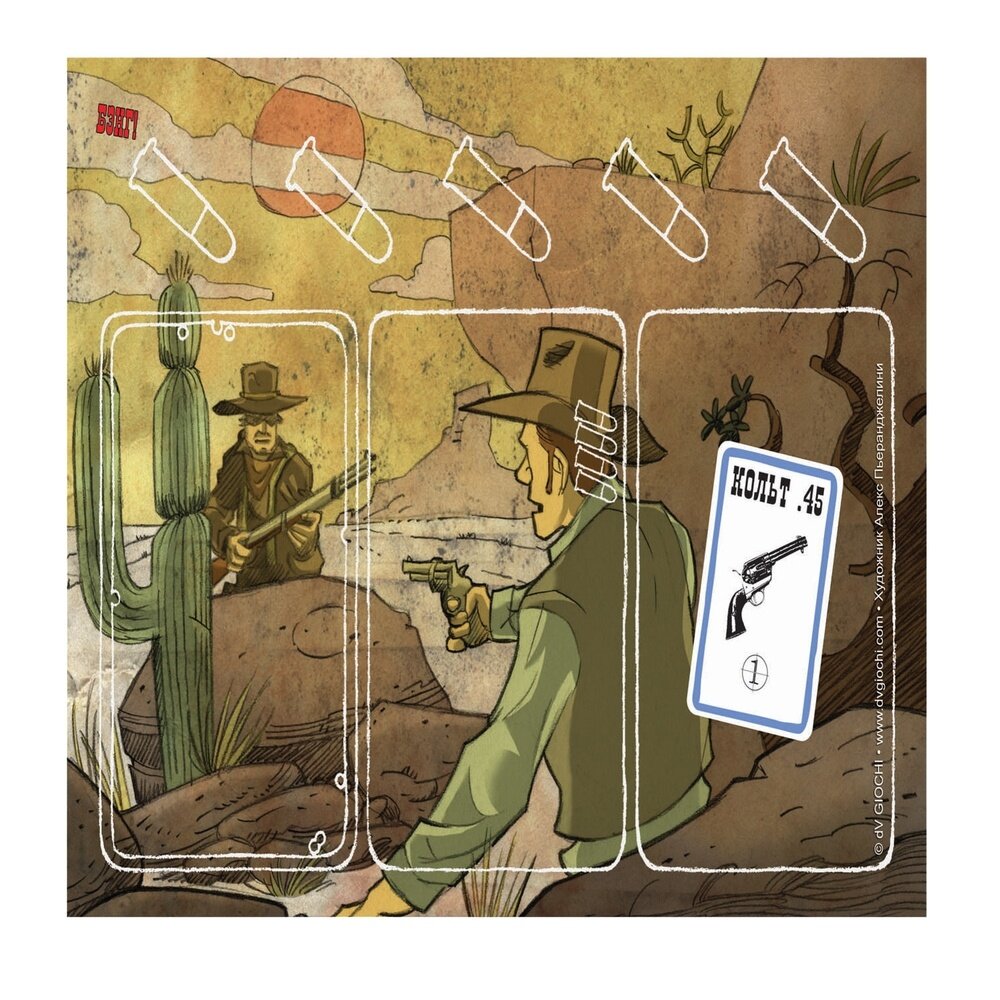 | Комплектация | 7 карт ролей, 16 карт персонажей, 80 игровых карт, 7 памяток, 7 планшетов, 30 жетонов патронов, правила игры |