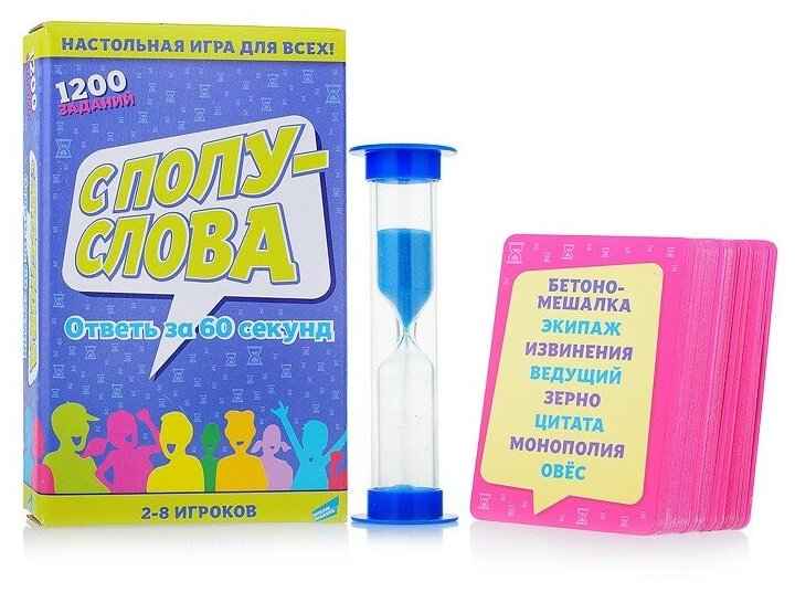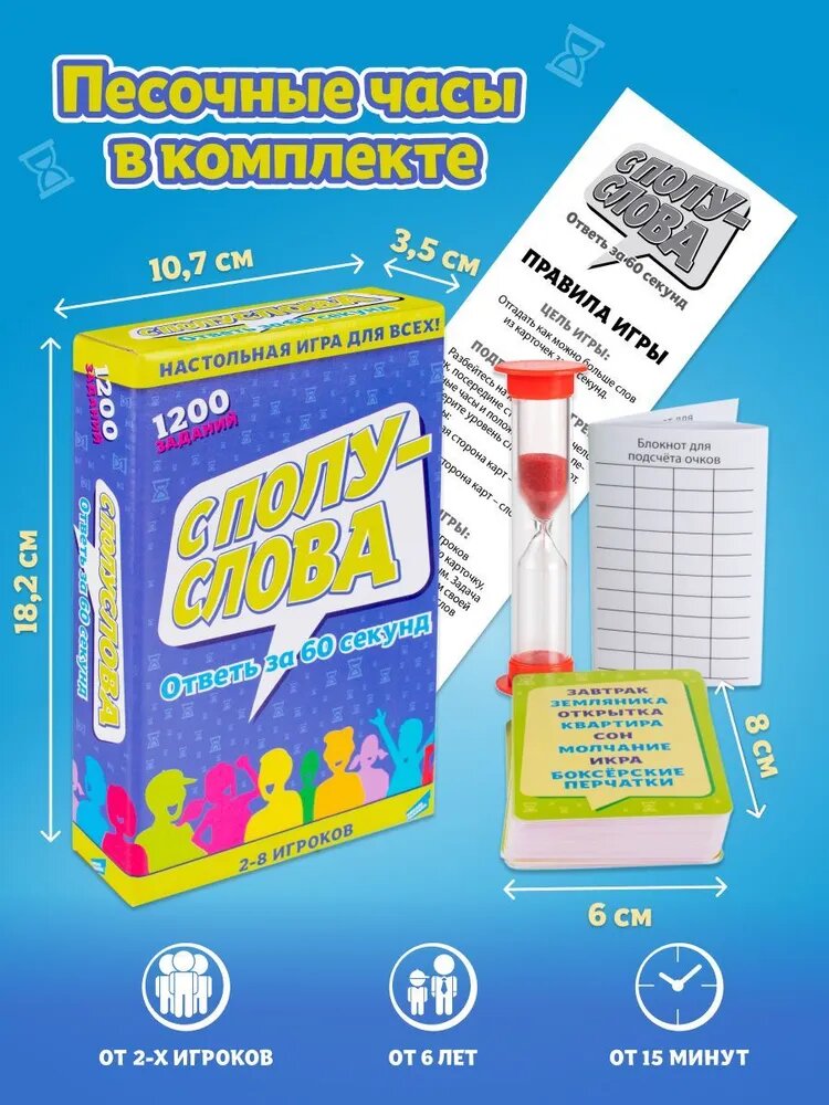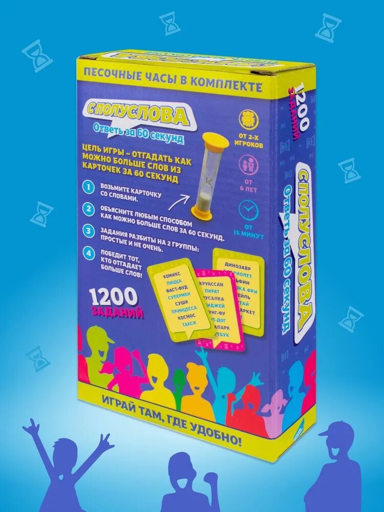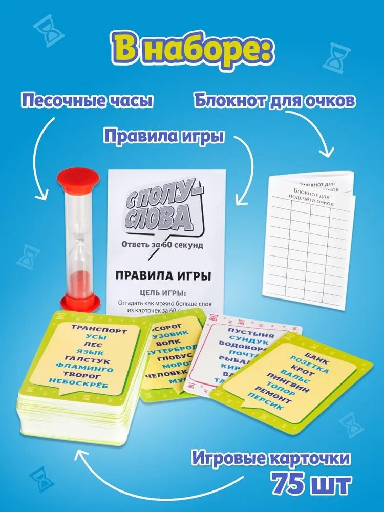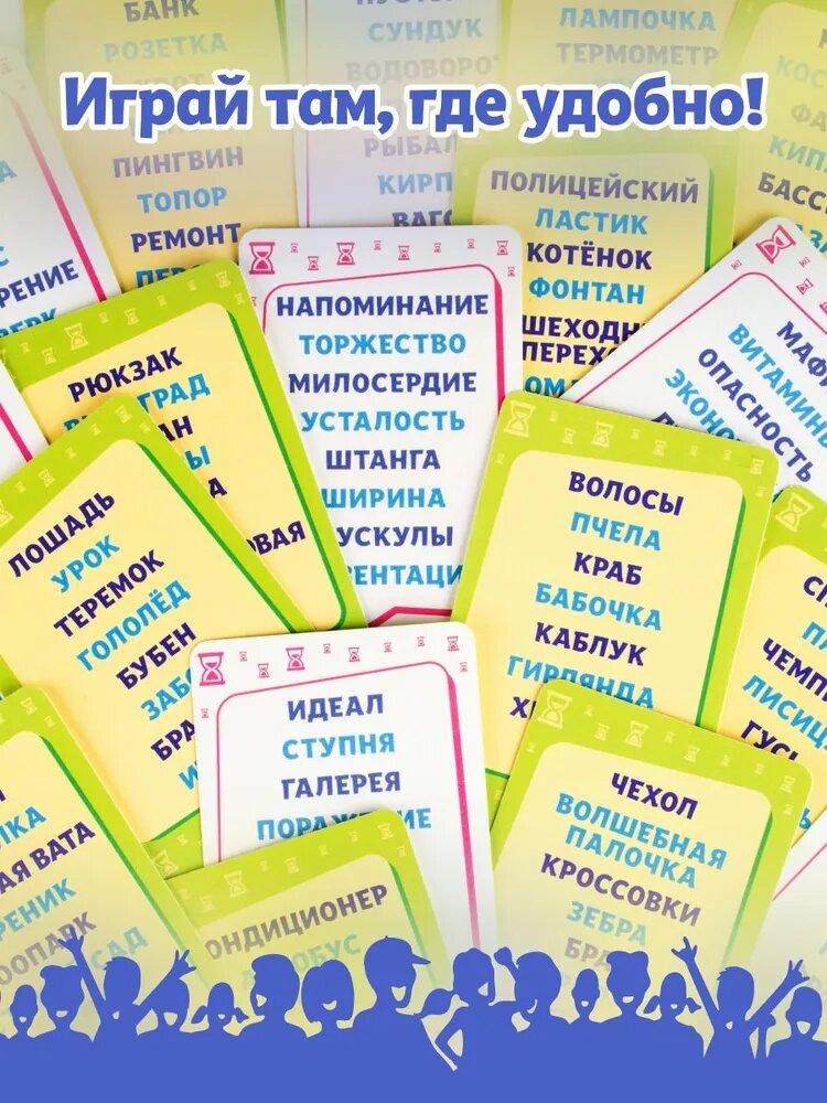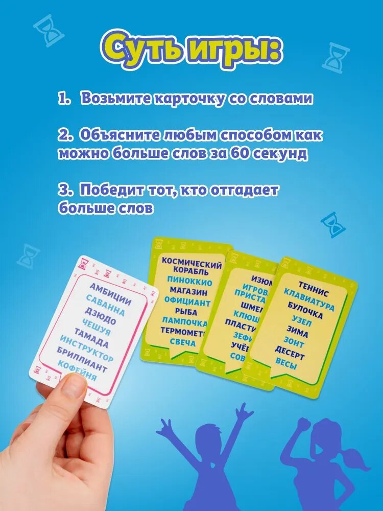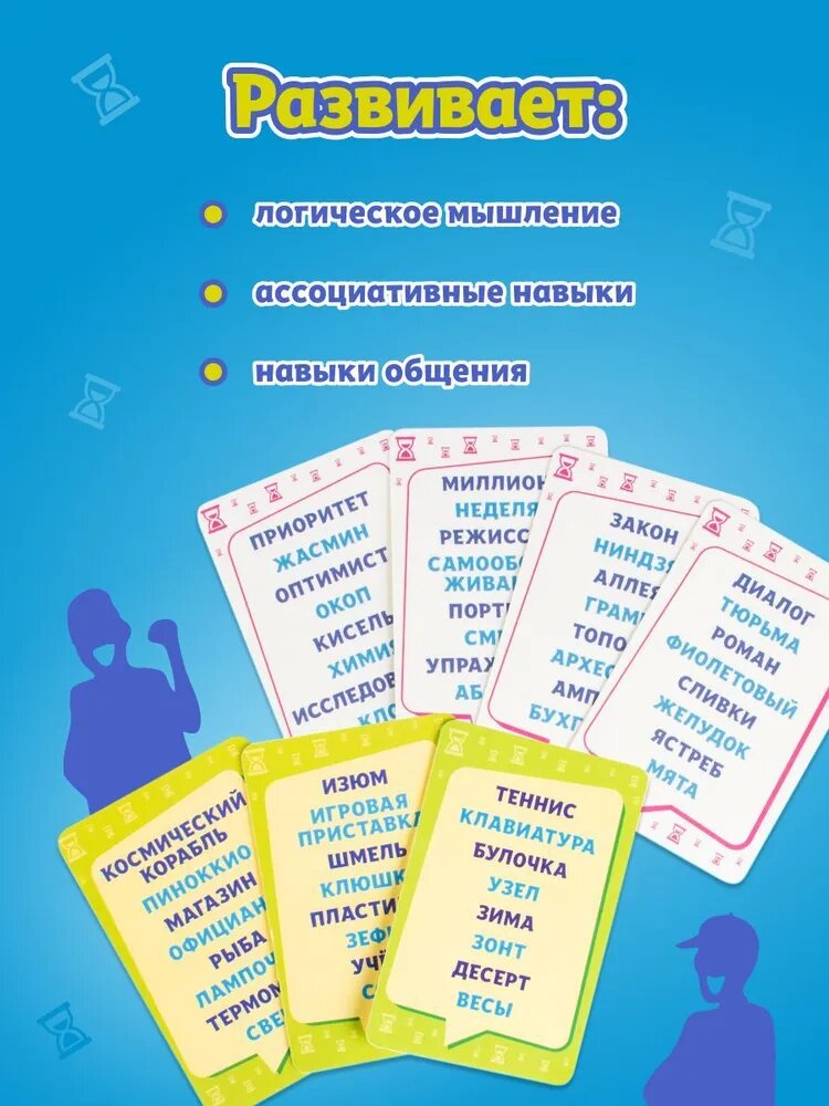 | Комплектация | игровые карточки - 75 шт.; правила игры - 1 шт.; песочные часы - 1 шт.; блокнот для очков - 1 шт |