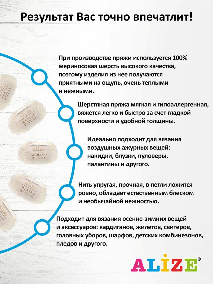 Пряжа для вязания крючком, спицами Alize Ализе Merino royal средняя, шерсть 100%, цвет 67 экрю, 5 шт. по 50 г, 100 м