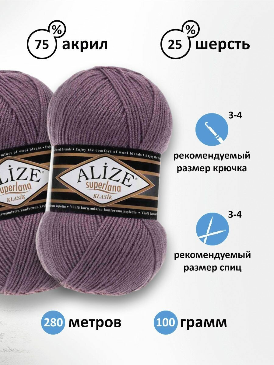 Пряжа ALIZE SUPERLANA KLASIK, пепельно-сиреневый - 505, 25% шерсть, 75% акрил, 5 мотков, 100 г, 280 м.