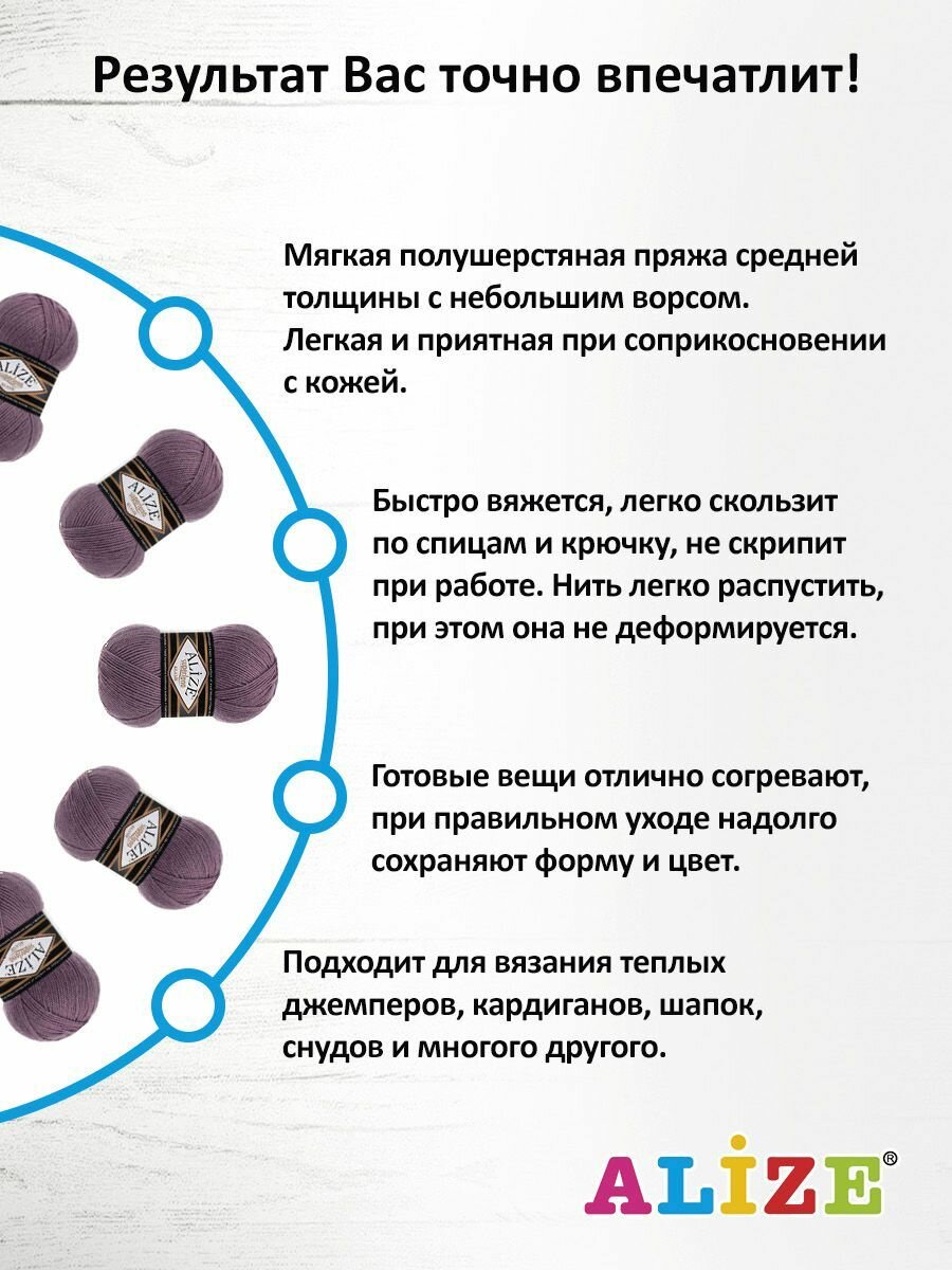 Пряжа для вязания ALIZE 'Superlana MIDI', 100г, 170м (25% шерсть, 75% акрил) (505 пепельно-сиреневый), 5 мотков