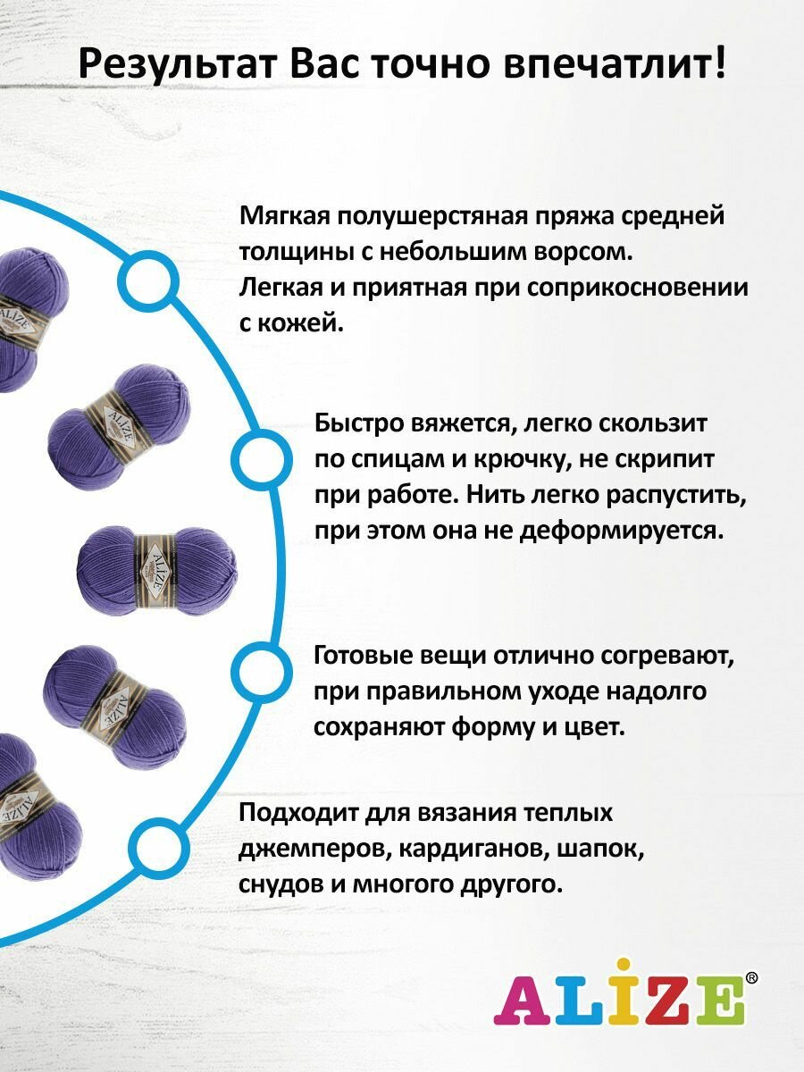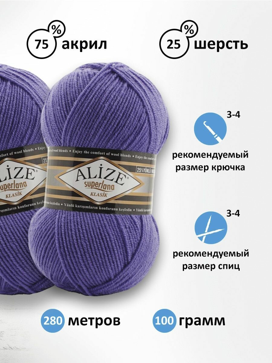 СохранитьПряжа для вязания ALIZE 'Superlana klasik' (однотонная), 100г, 280м (75% акрил, 25% шерсть), ТУ (851 фиолетовый), 5 мотков интересное: