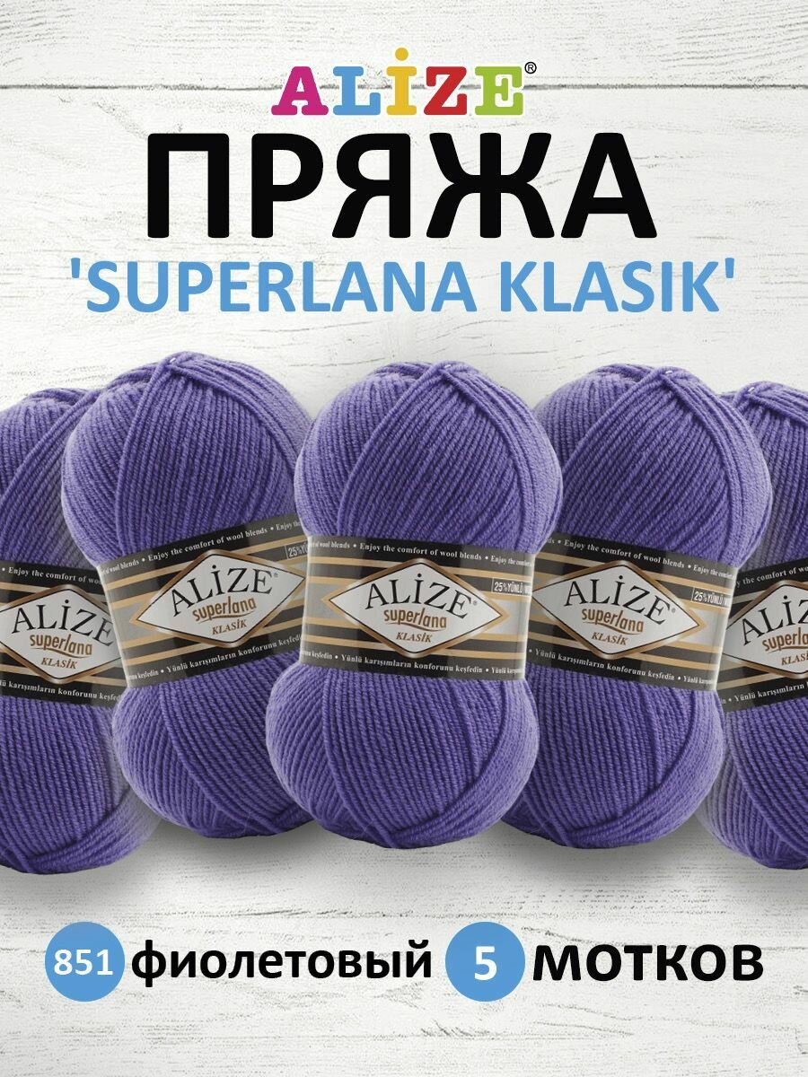 Купить Пряжа для вязания ALIZE 'Superlana klasik' (однотонная), 100г, 280м (75% акрил, 25% шерсть), ТУ (851 фиолетовый), 5 мотков
