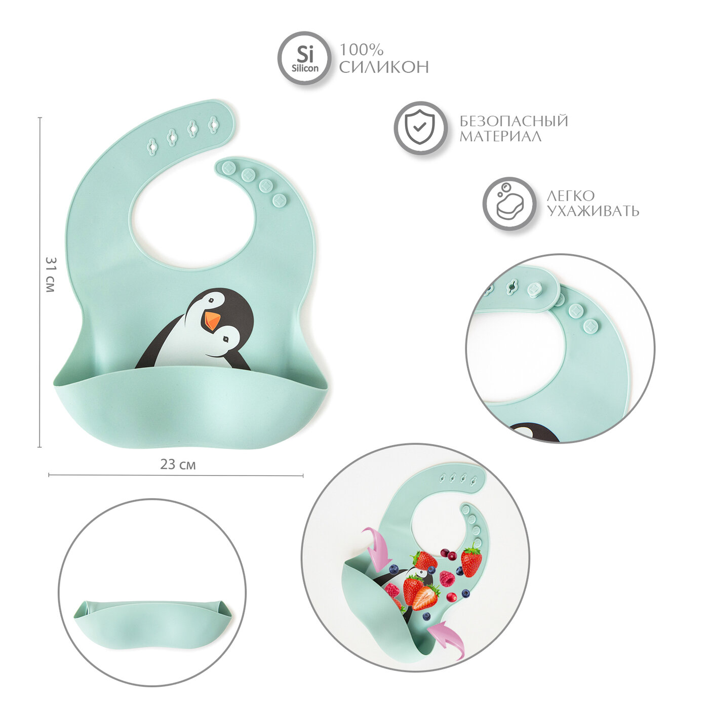 Купить Нагрудник для кормления детский силиконовый с кармашком, Baby Nice, 21х28, "Пингвиненок", мятный