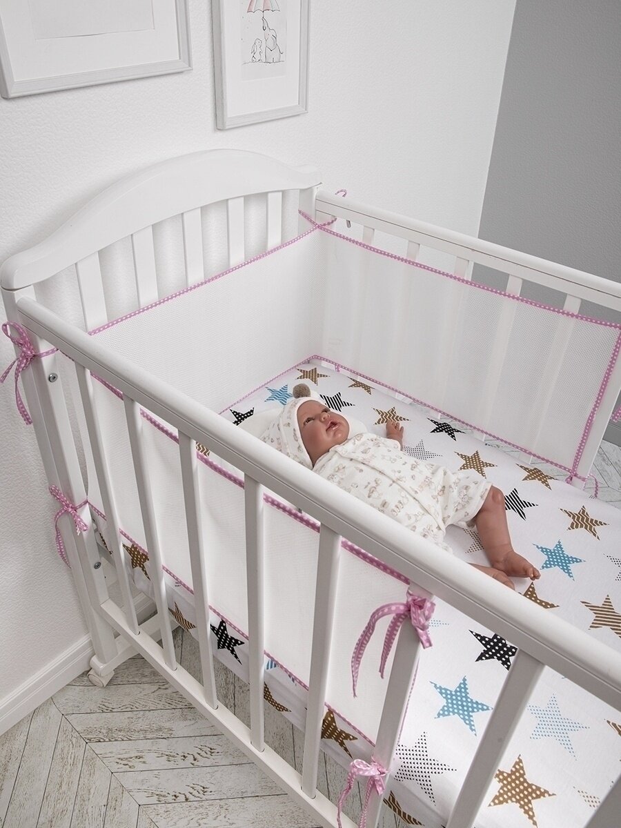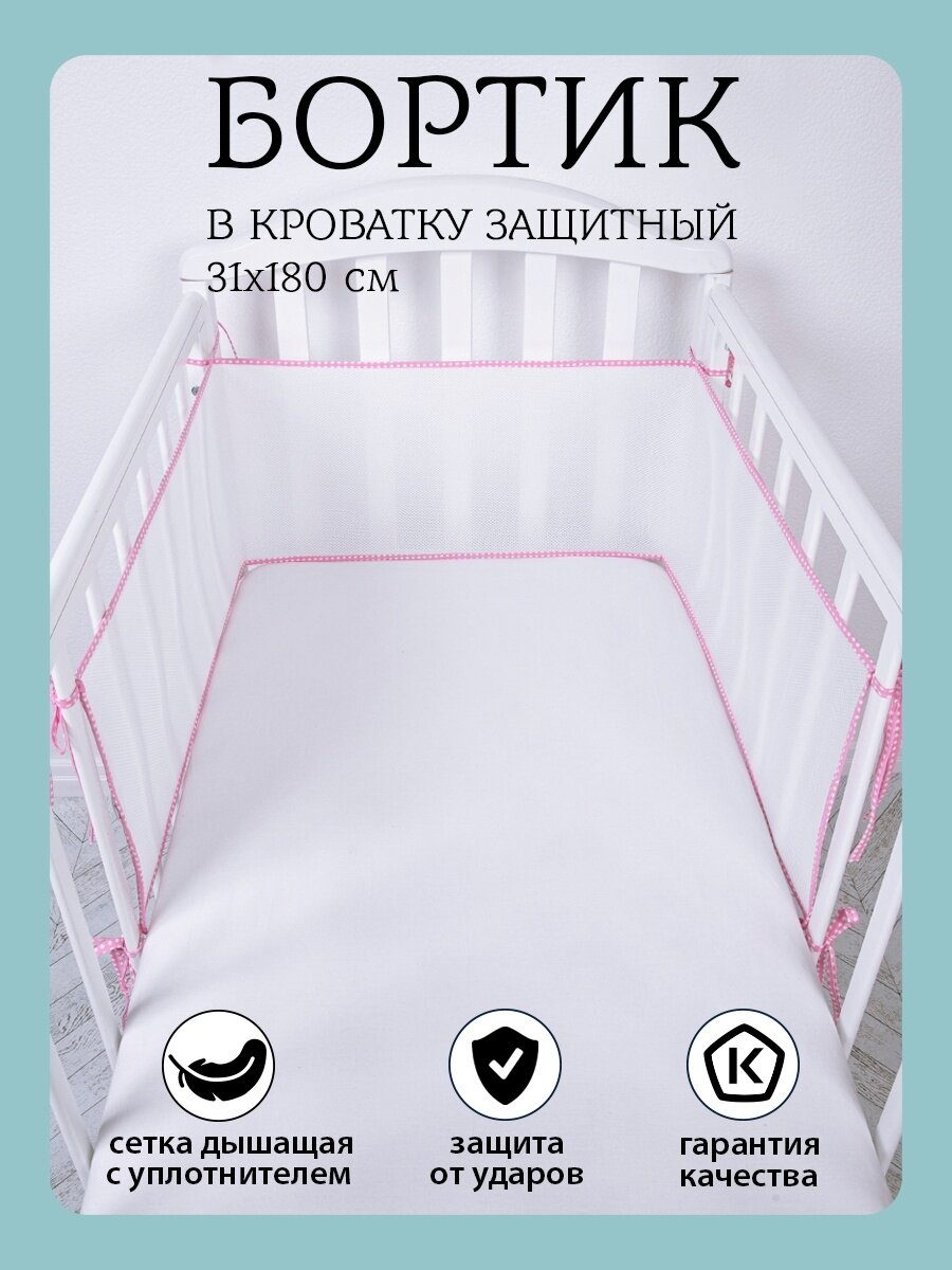 СохранитьБортики в кроватку для новорожденных сетка 31х180, на прямоугольную, круглую, овальную кровать, цвет розовый интересное: