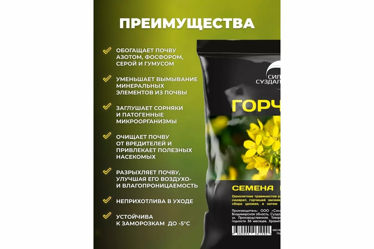 Горчица семена Сила Суздаля / сидерат / зеленое органическое удобрение, 1 кг