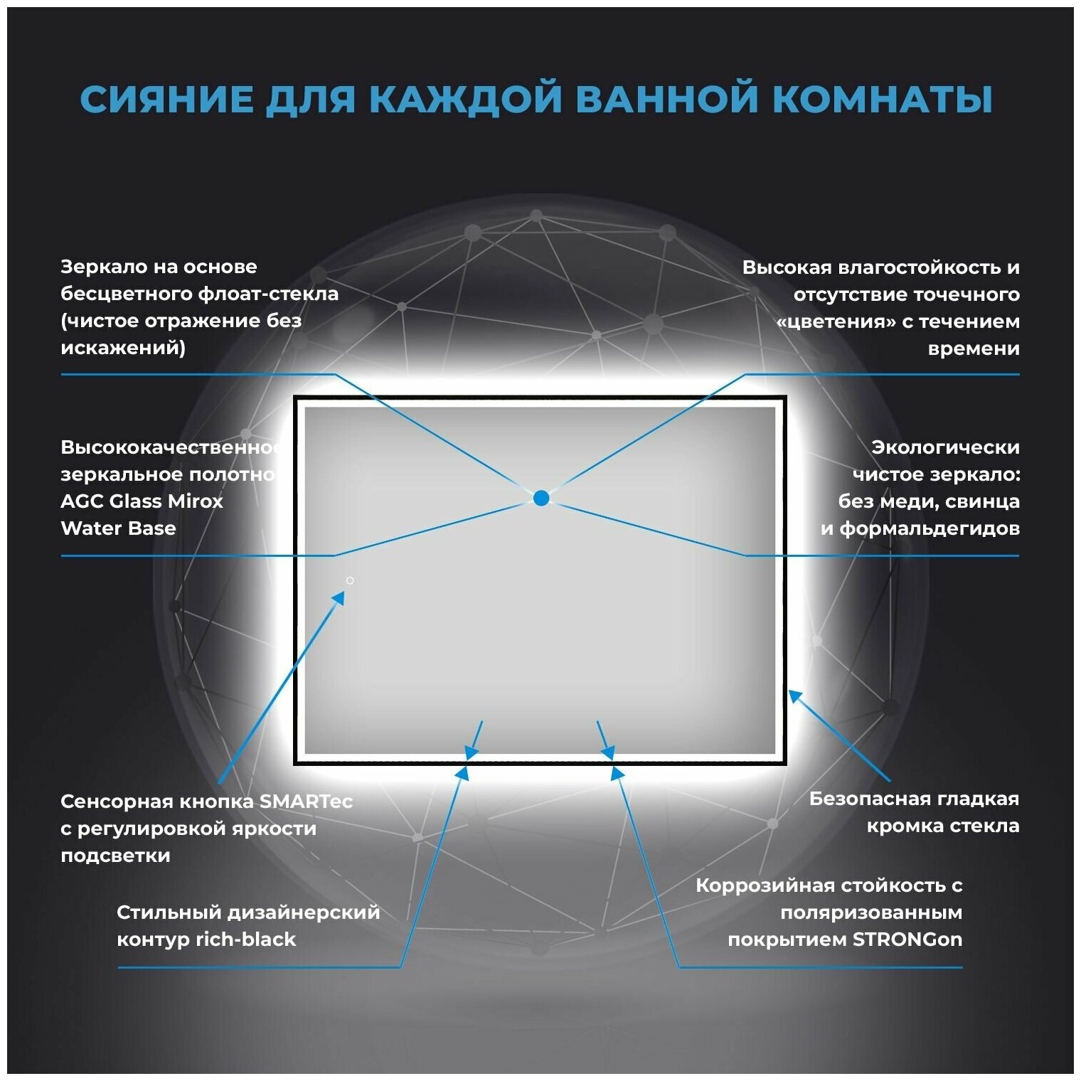 Настенное зеркало в ванную с подсветкой Wellsee 7 Rays' Spectrum 172201070 : влагостойкое большое зеркало 100х80 см с черным матовым контуром
