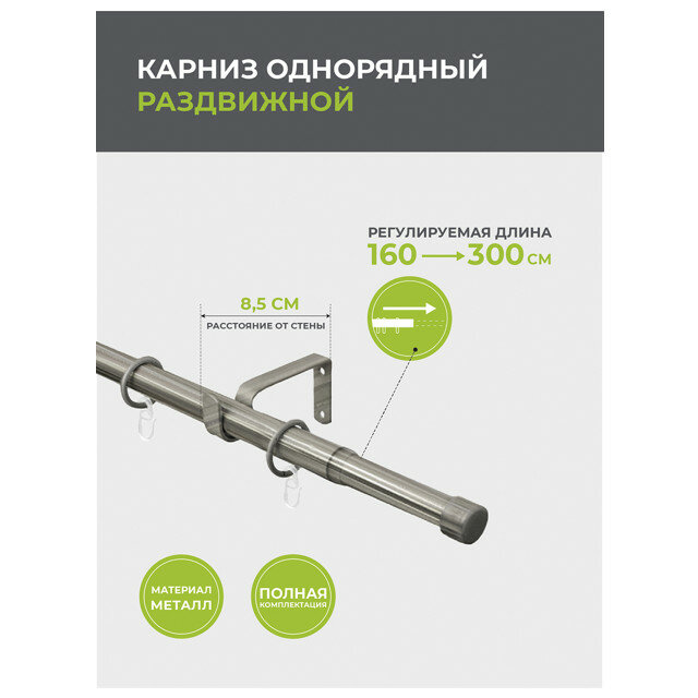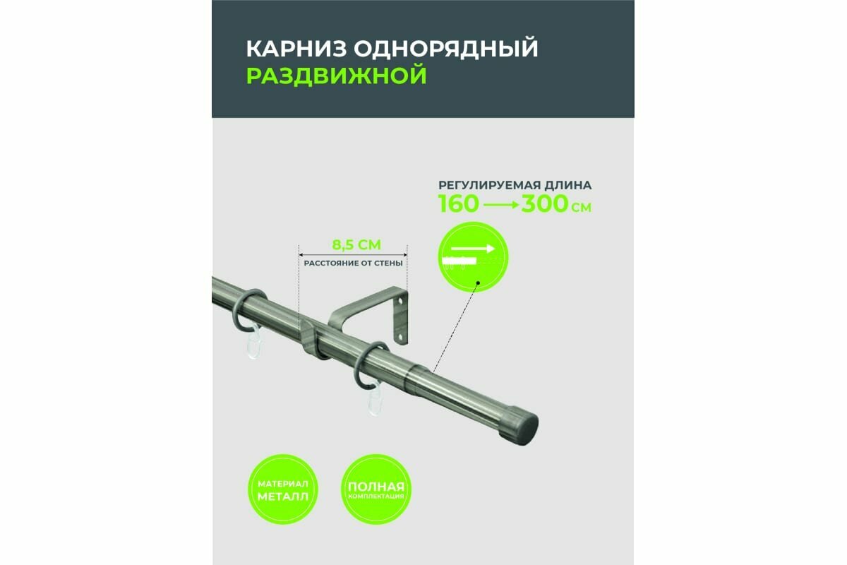 Карниз настенный металлический однорядный раздвижной 160-300 см d16/19 мм хром матовый (6761)