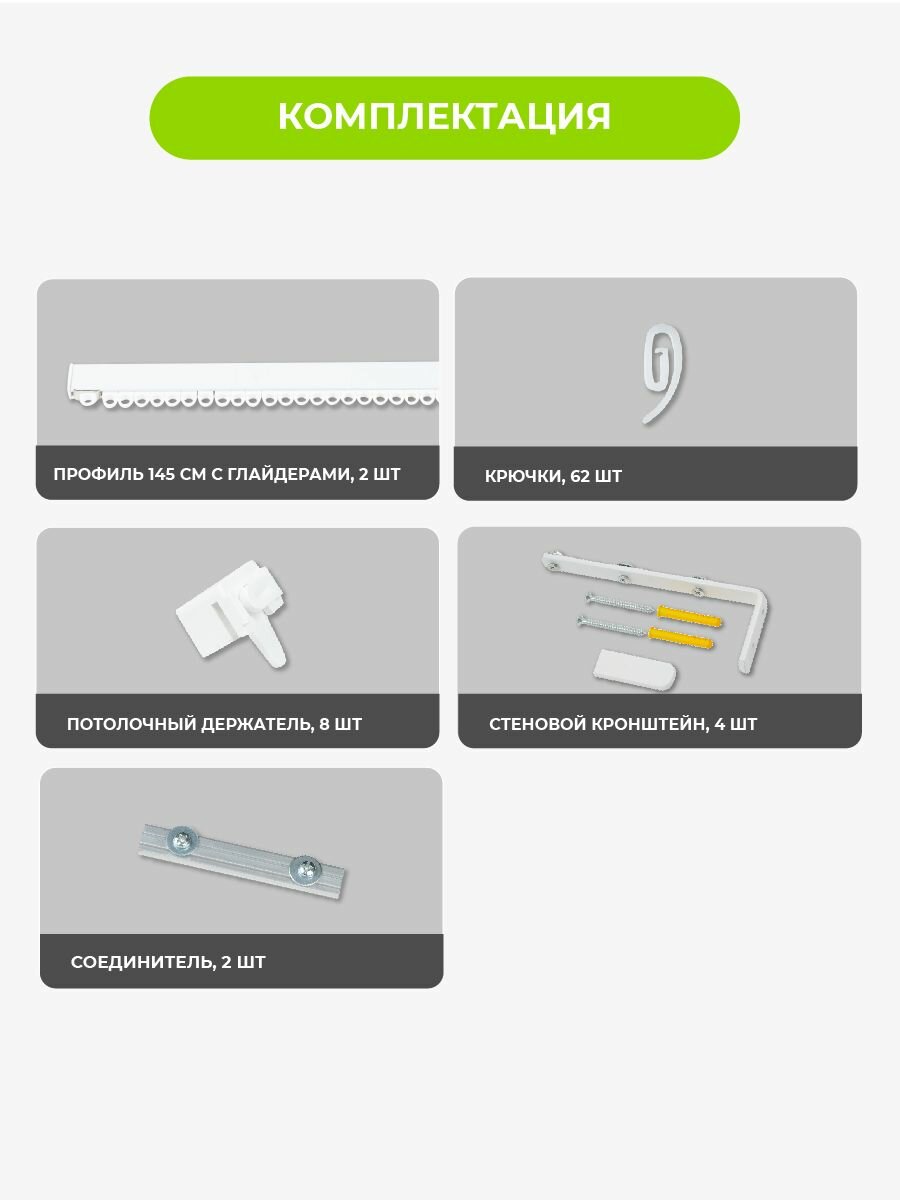 | Комплектация | Направляющая раздвижная - 1 шт, наконечники - 2 шт, держатели - 3 шт, кольца с крючками - 25 шт, шурупы с дюбелями - 6 шт. |