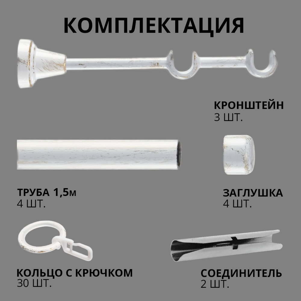 | Комплектация | труба для карниза 1,5м 4 шт, кронштейн для карниза 3 шт, наконечник для карниза заглушка 4 шт, соединитель для карниза 2 шт, кольца для штор с крючками 30 шт |