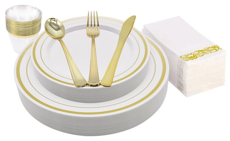 СохранитьОдноразовая пластиковая посуда для сервировки стола на 12 персон. В наборе 84 предмета: тарелки, ножи, вилки, ложки, стаканы, салфетки. Золото интересное: