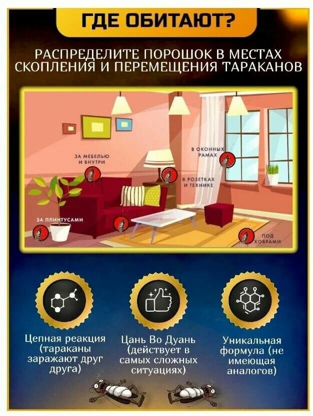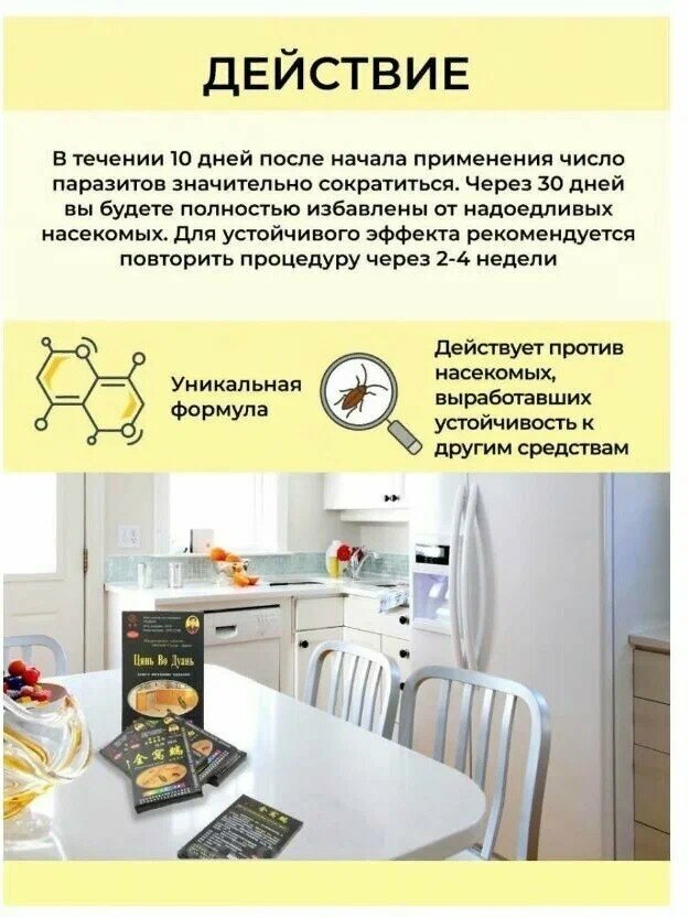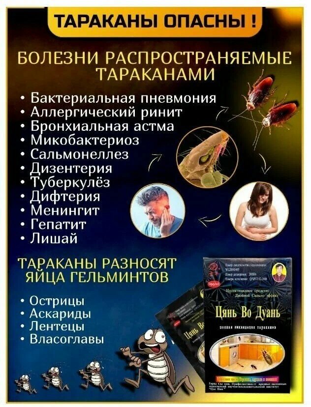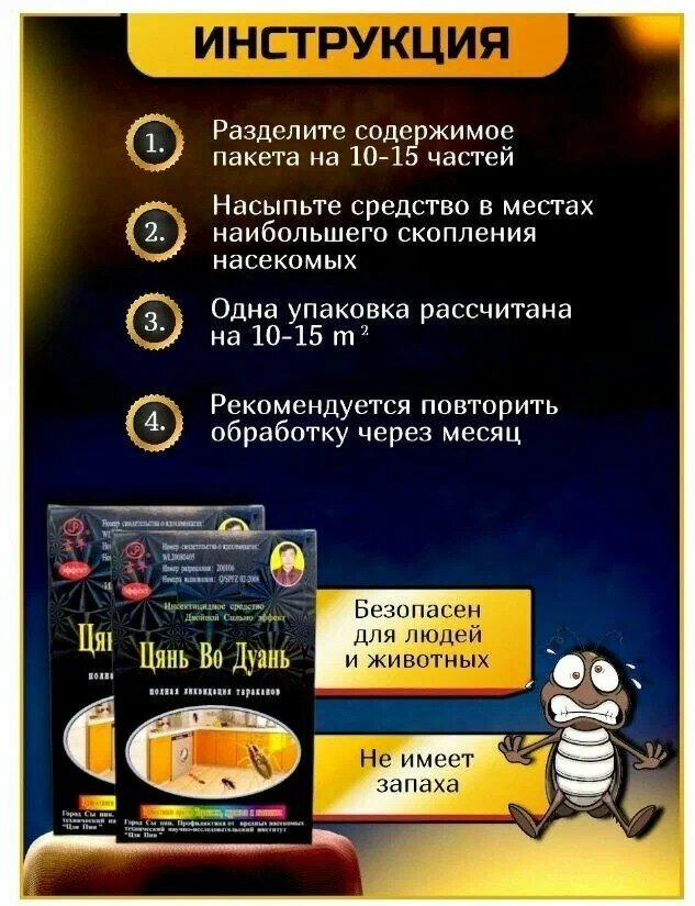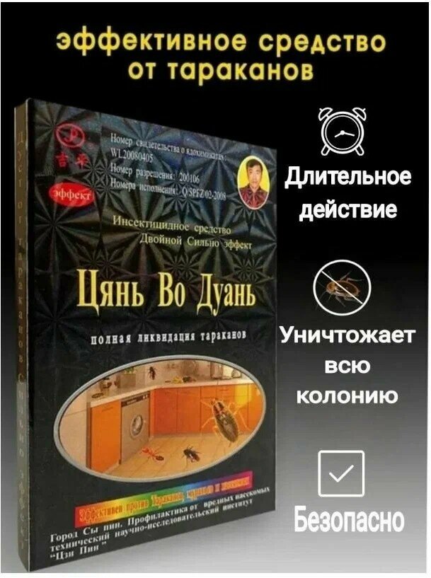 | Дополнительная информация | Порошок Цянь Во Дуань не только эффективно уничтожает тараканов, но и предотвращает их повторное появление |