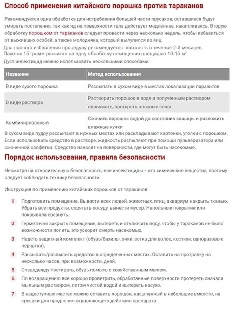| Дополнительная информация | Порошок Цянь Во Дуань не только эффективно уничтожает тараканов, но и предотвращает их повторное появление |