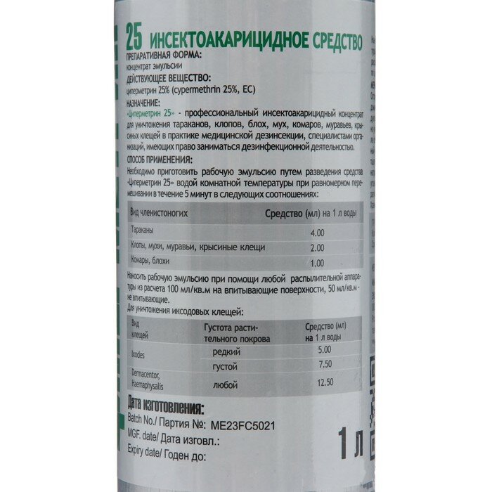Циперметрин 25 средство от клопов, тараканов, клещей, ос, мух, комаров, 1л