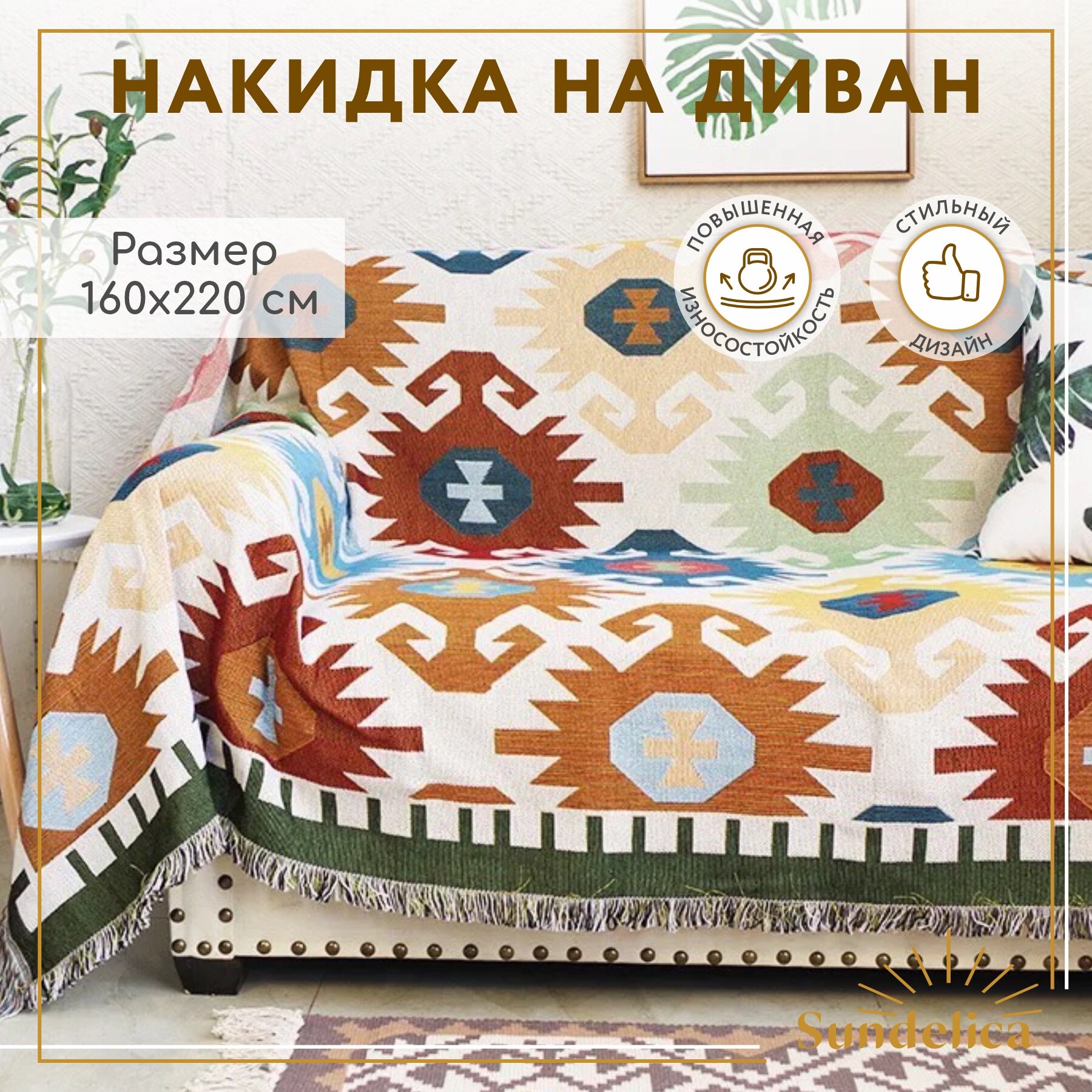 Покрывало Sundelica на диван, на кровать, на кресло, дизайн "Орнамент", размер 160x220 см, с бахромой