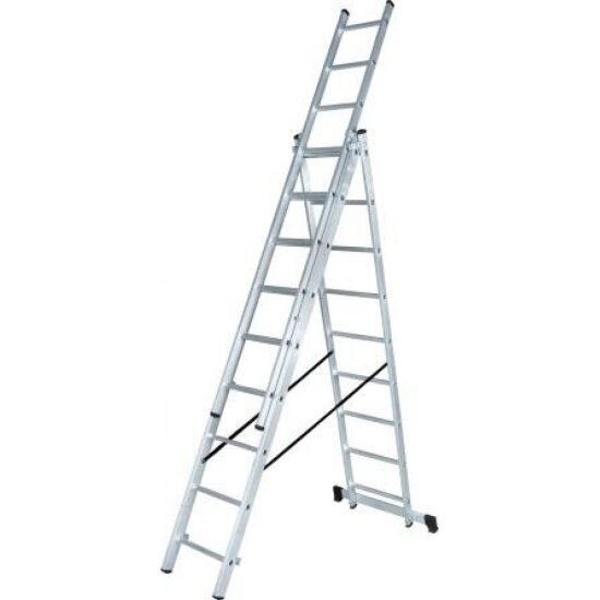 Лестница удобная складная трехсекционная. На каждой секции 9 ступеней. Использую, как стремянку и как выдвижную лестницу. Третью секцию использую, как отдельную лестницу. Есть поперечная траверса, для фиксации положения. Сделана из алюминия и хранить удобно, много места в гараже не занимает.