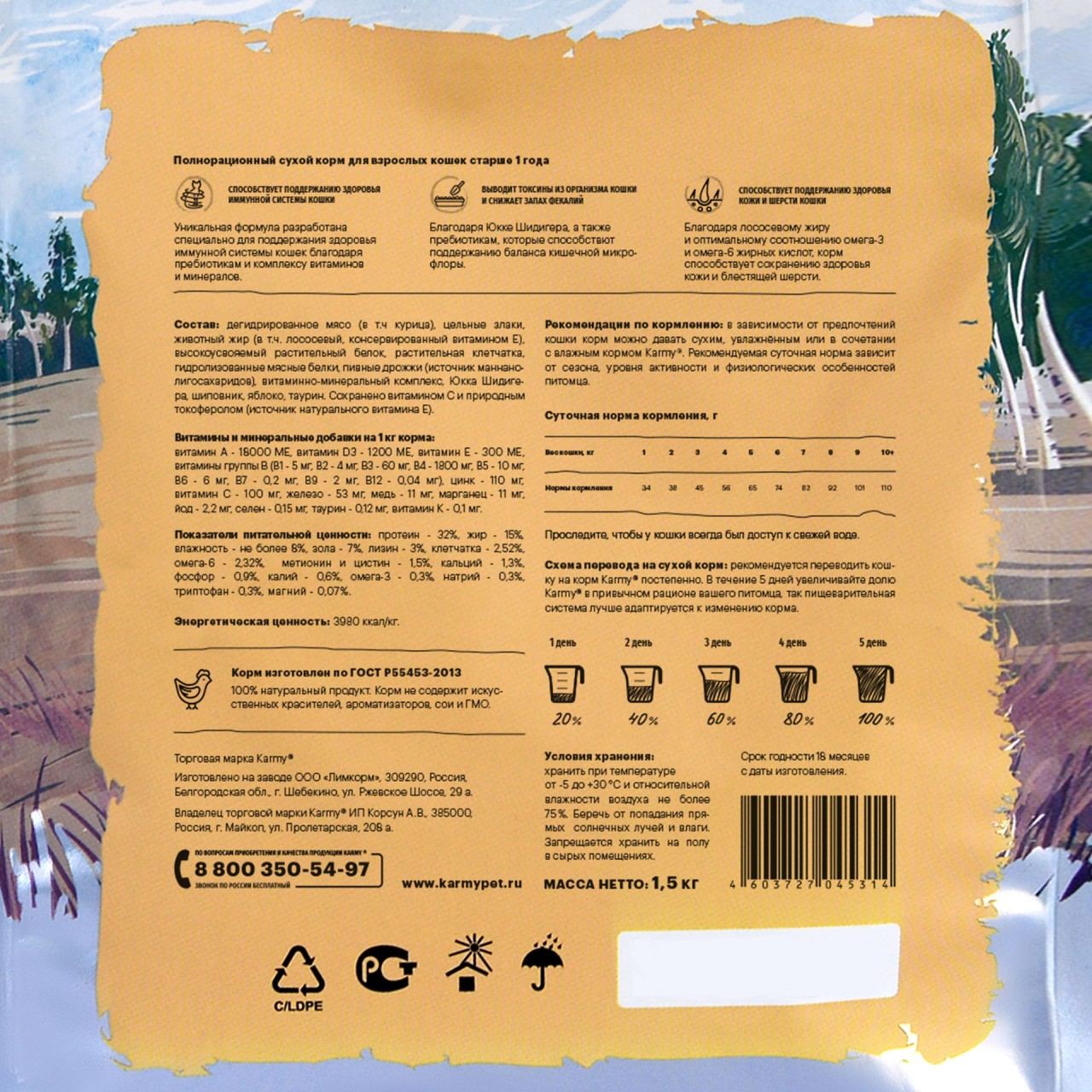 | Отзыв: | Продавец посоветовала "Карми". Cостав ничем не хуже многих импортных аналогов. Мясо, жиры, витамины, клетчатка и главное, пробиотики - именно то, что нужно кошке.