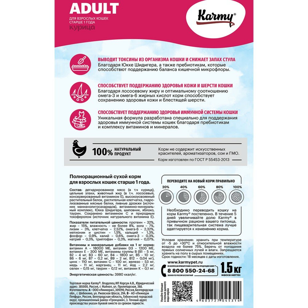 Сухой корм Karmy Adult Курица - для взрослых кошек старше 1 года 1,5кг