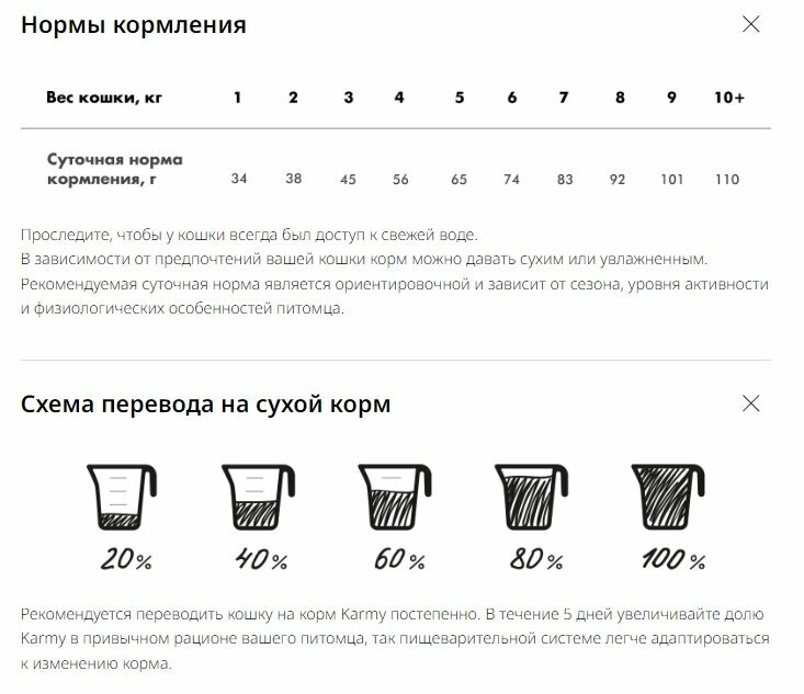 Много видов у karmy. Я обычно заказываю мешки по 1о кг , стоимость меня устраивает. Крокеты темного цвета, кругленькие, мелкие, жирноваты, запах не сильный, ароматизаторами не пахнет. Кошка ест с удовольствием, переваривает отлично, выход хороший, кучки сформированные и острого запаха нет. |