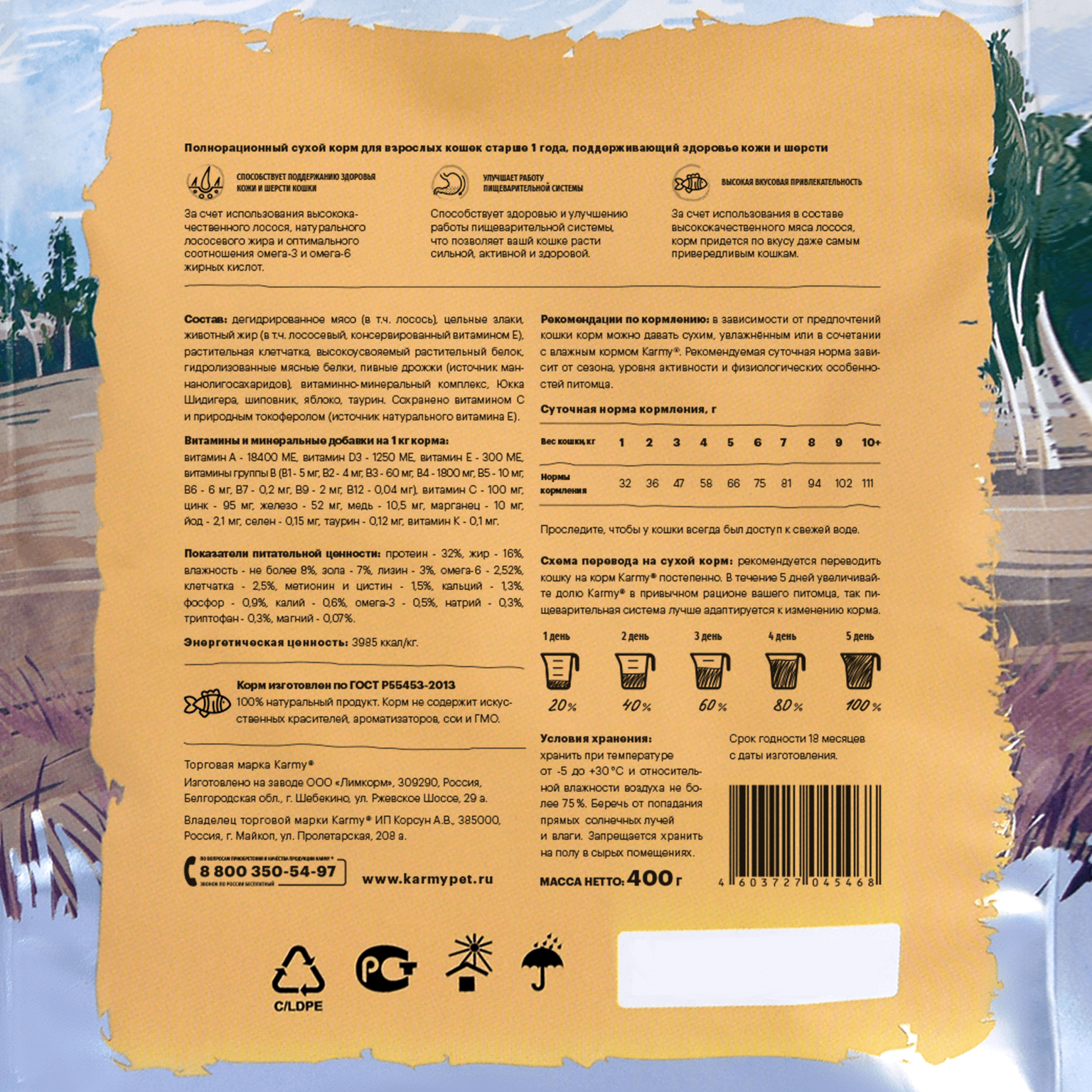 Karmy корм для взрослых кошек, идеальная кожа и шерсть, лосось 400 гр