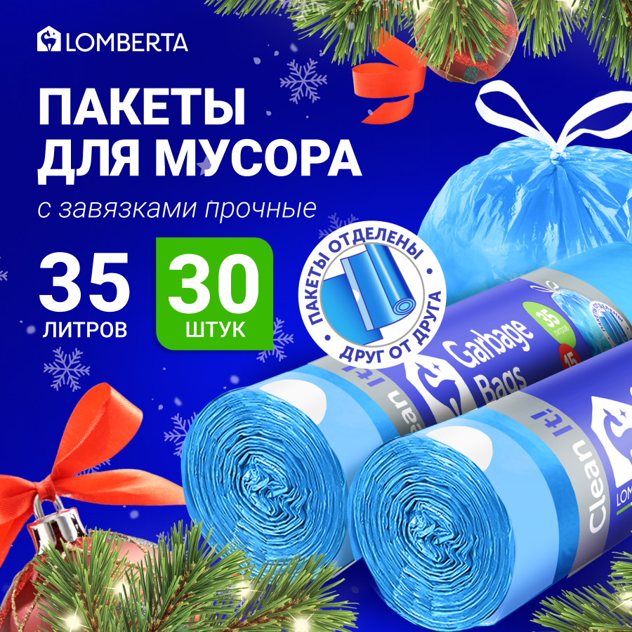 Купить Мешки для мусора Lomberta 35 л, плотные с завязками, с технологией Overlap (мешки уже оторваны друг от друга и сложены в рулон), 30 шт