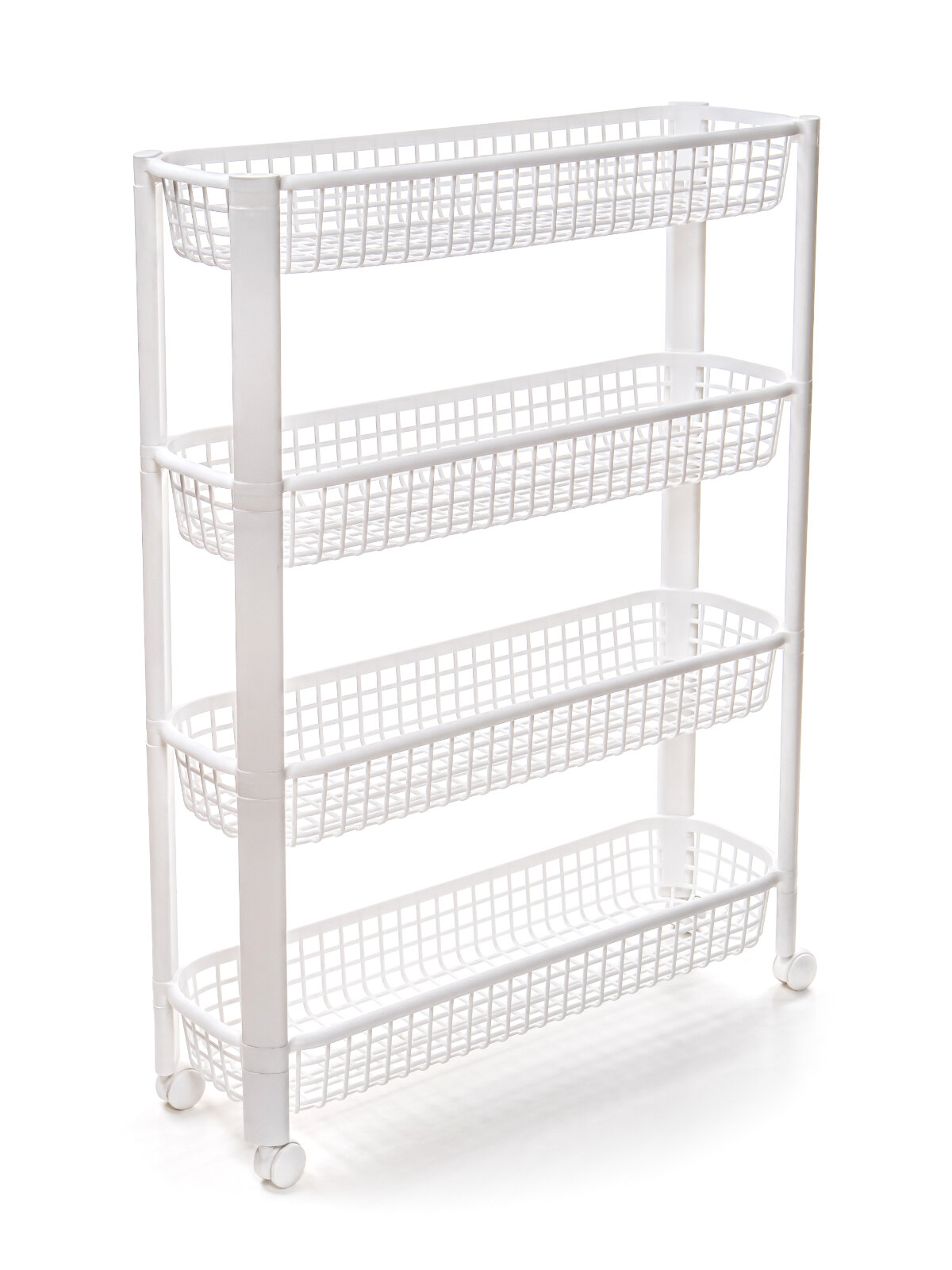 Купить Этажерка-полка пластиковая узкая на колесиках белая, 4 яруса
