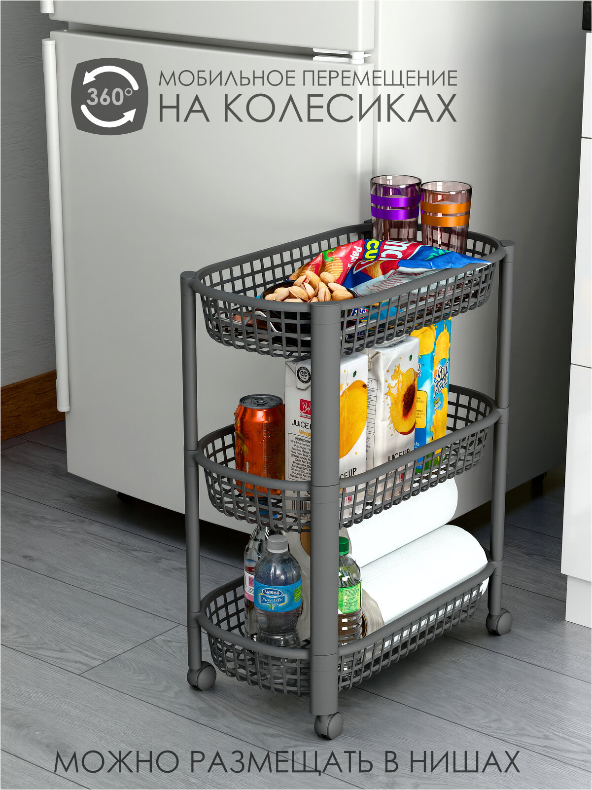 Этажерка в ванну, на кухню на колесах 3-ярусная графитовая, 46,4х25,5х56,5 см интересное: