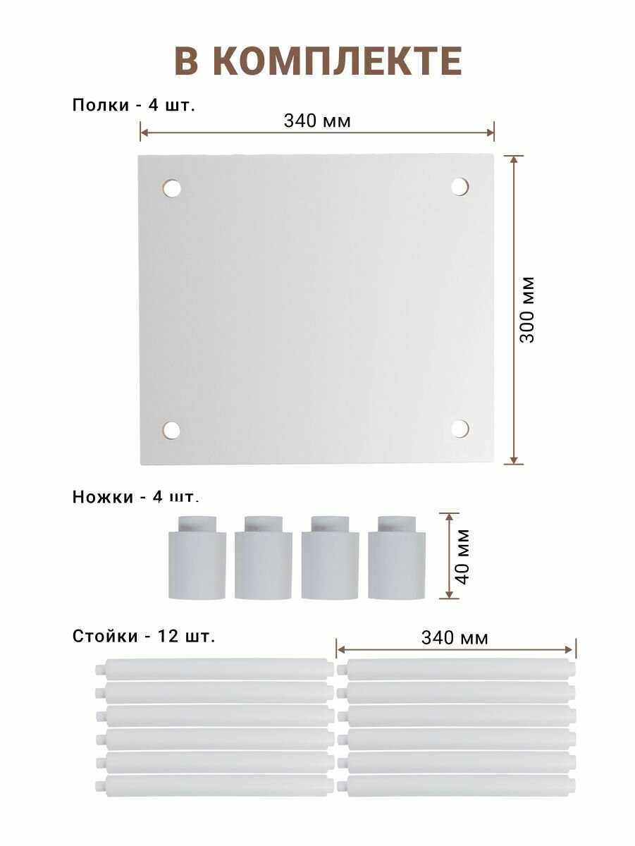| Комплектация | полка ЛДСП с 4 футорками - 1 шт.; полка ЛДСП с 4 сквозными отверстиями - 3 шт.; стойка пластик - 12 шт.; ножка пластик - 4 шт.; Инструкция по сборке - 1 шт. |