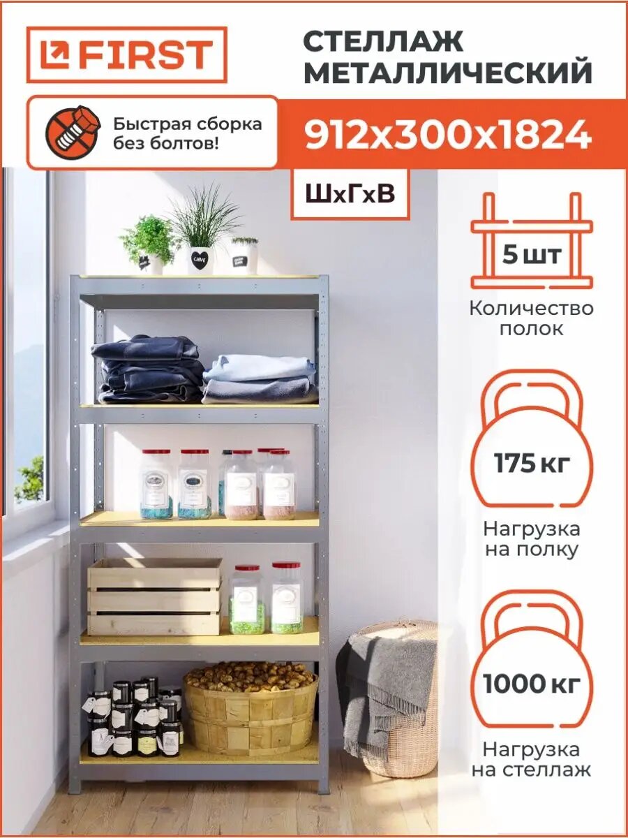 Стеллаж металлический HIT BOARD 912х1824х400/5 полок МДФ, оцинкованный, 91.2х40х182.4 см
