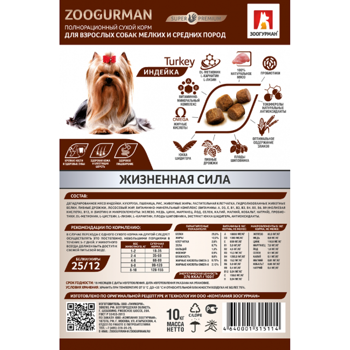 Купить ZOOGURMAN для взрослых собак маленьких и средних пород с индейкой (10 кг)