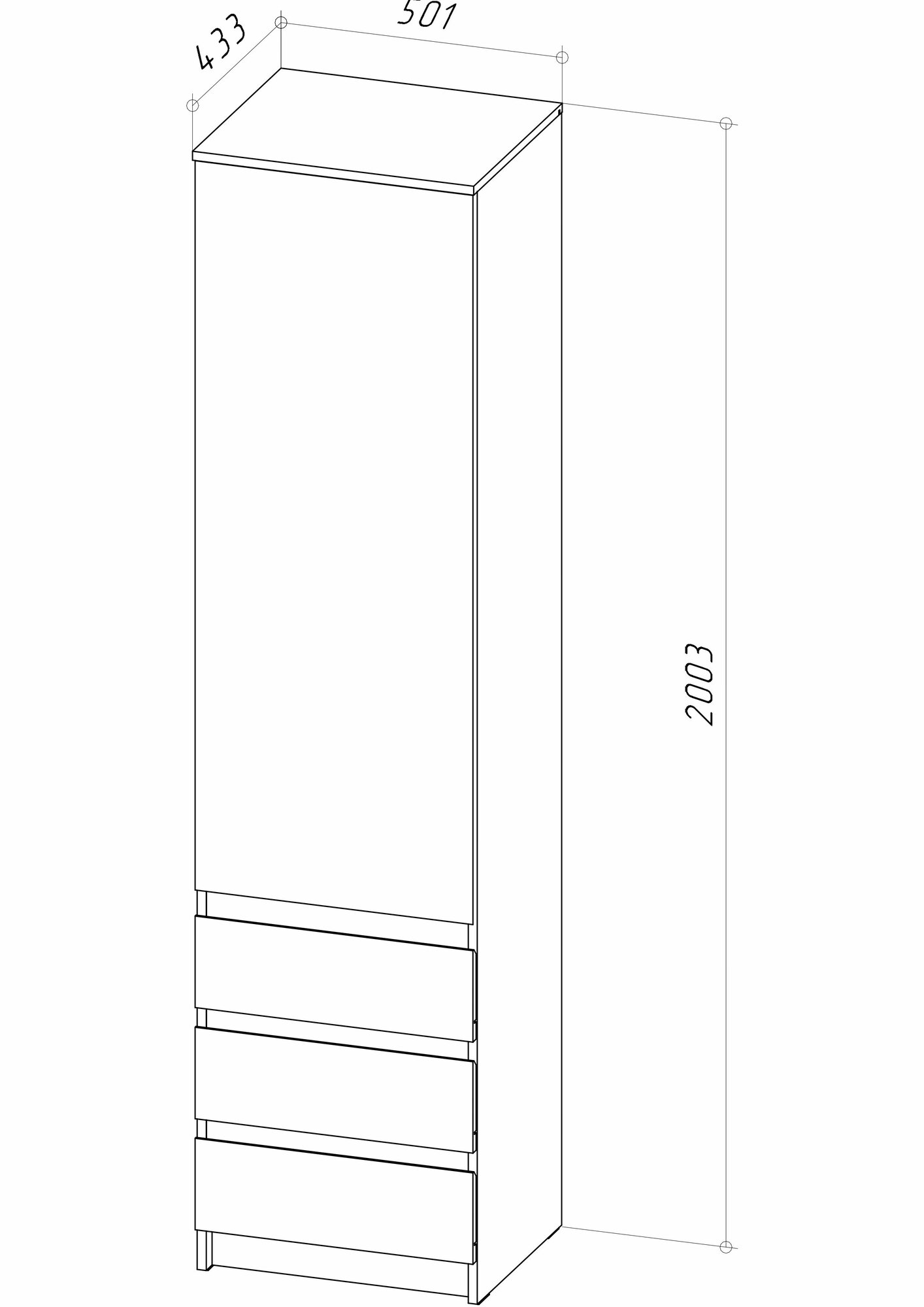 | Комплектация | 1 дверца, 3 ящика, 4 полки |