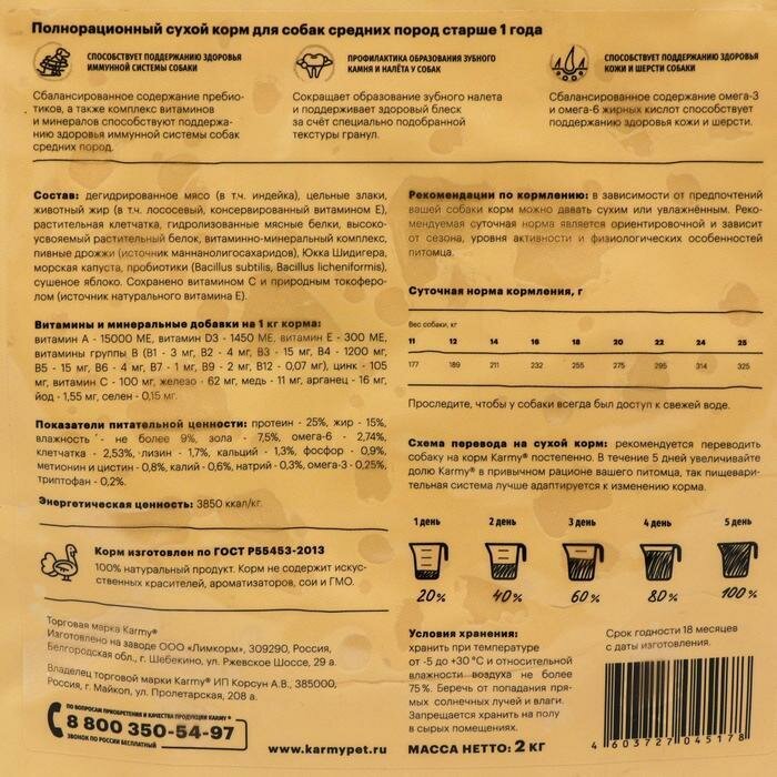 #(3+1)Карми 47370 Medium Adult сух.д/собак средних пород Индейка (Мелькомбинат) 14кг
