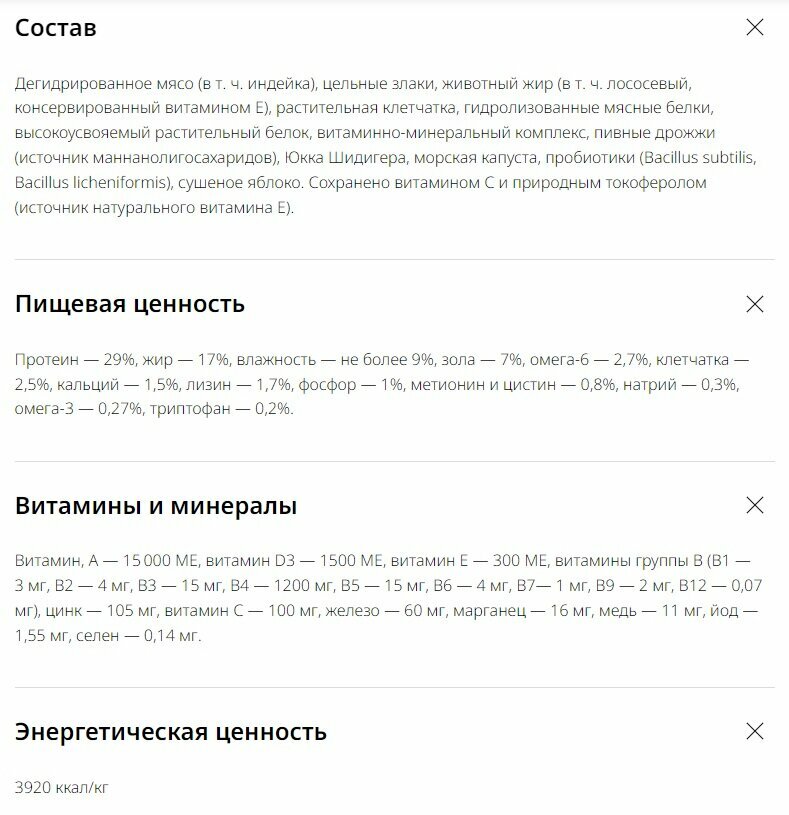 | Плюсы: | У корма приятный запах,хорошо влияет на пищеварение,шерсть . Приемлемая цена,высокое содержание мяса в составе. |