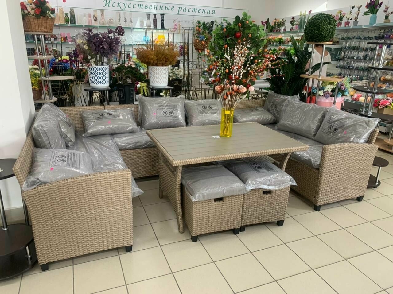 | Комплектация | Три дивана, два пуфа, обеденный стол |