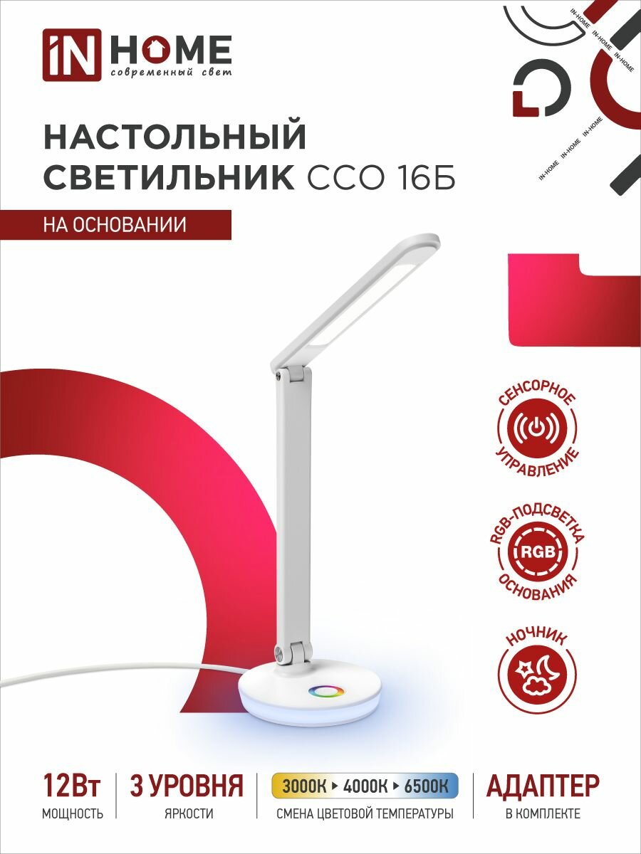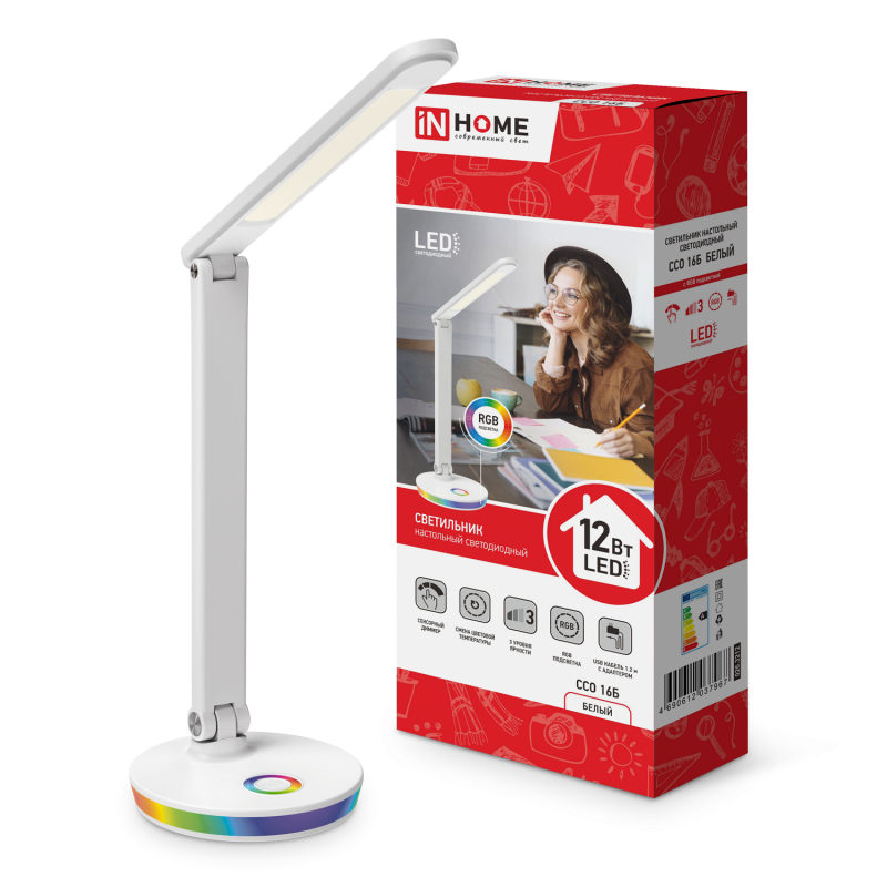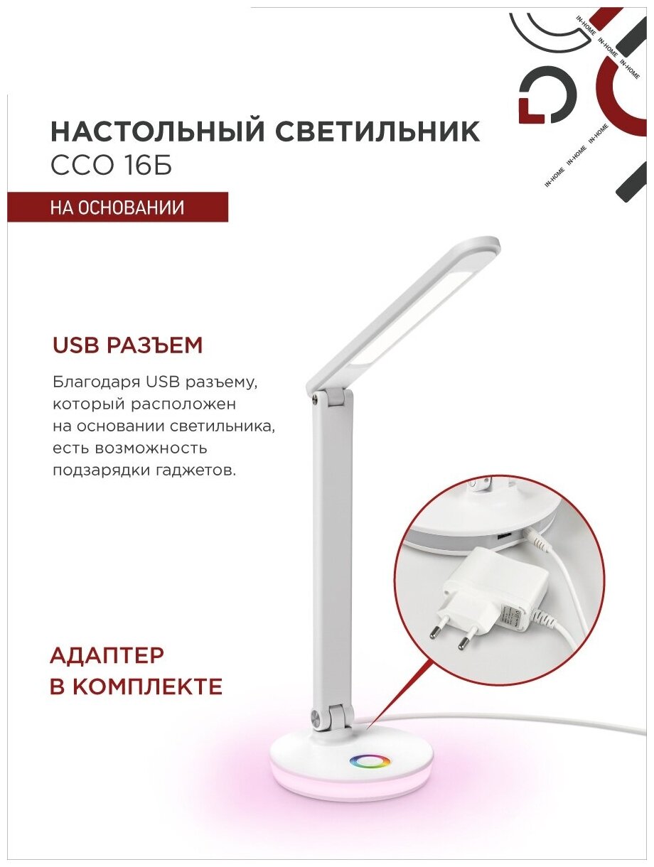 Светильник настольный светодиодный ССО 16Б 12Вт 3000-6500К 600Лм RGB-подсветка, сенсор-диммер, USB разъем, с адаптером белый IN HOME